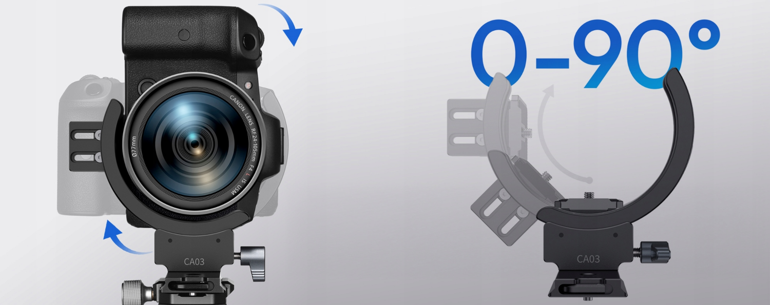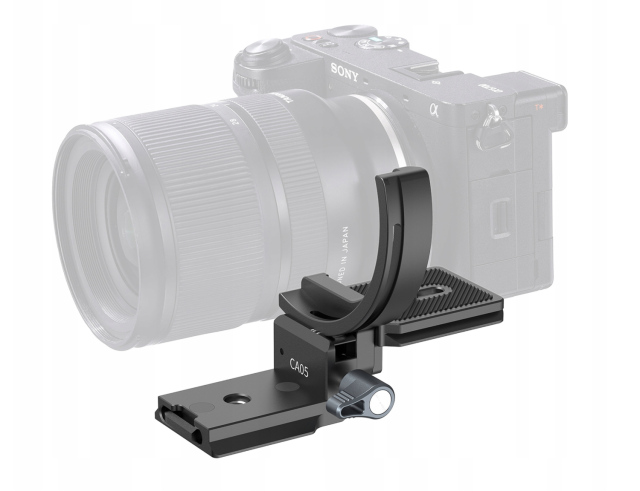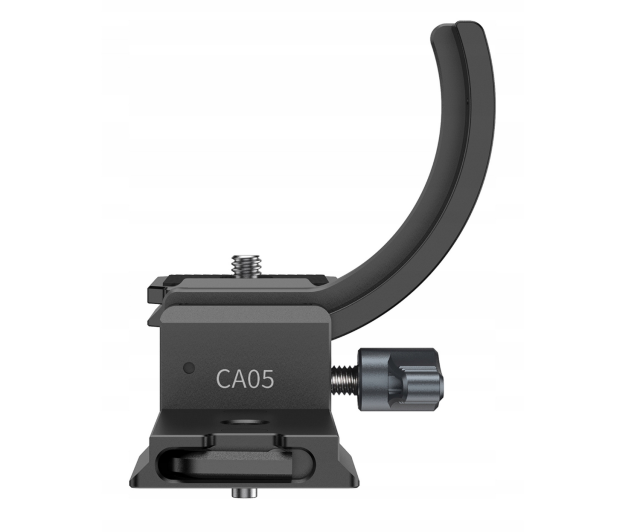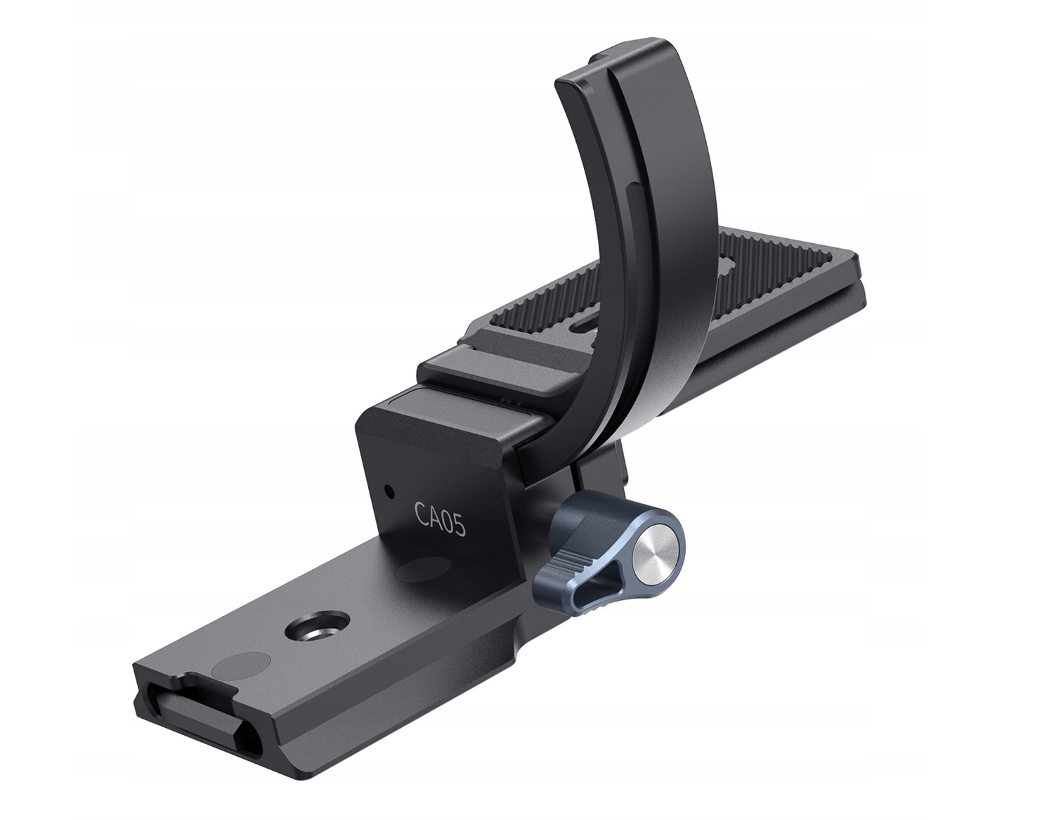With its adjustable platform height, the CA05 adapts easily to different lens designs, while the semi-circular collar design allows installation without removing the lens from the camera. Constructed from scratch-resistant aluminum and steel, this mount supports equipment weighing up to 5 kg, yet remains impressively lightweight for portable setups.