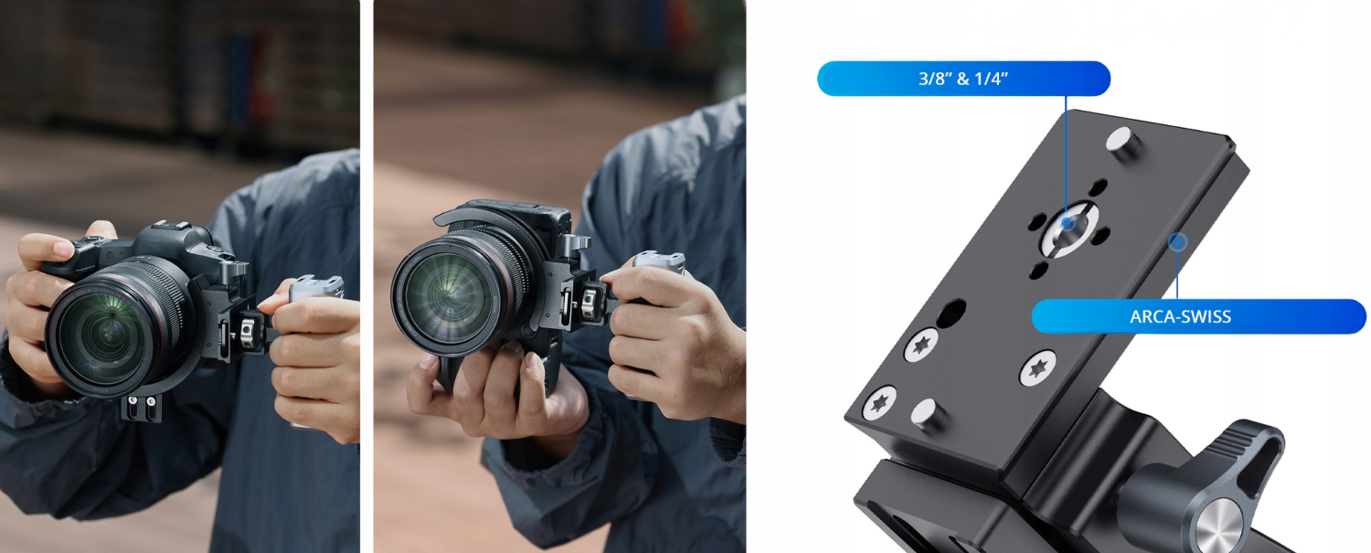 The integrated Arca-Swiss–compatible plate allows for quick mounting on most tripod heads, sliders, and gimbals. For expanded compatibility, the base also includes 1/4"-20 and 3/8"-16 threaded mounts, making it suitable for a wide range of supports.