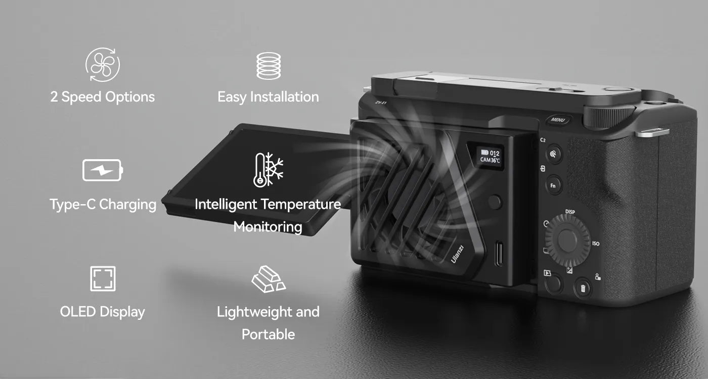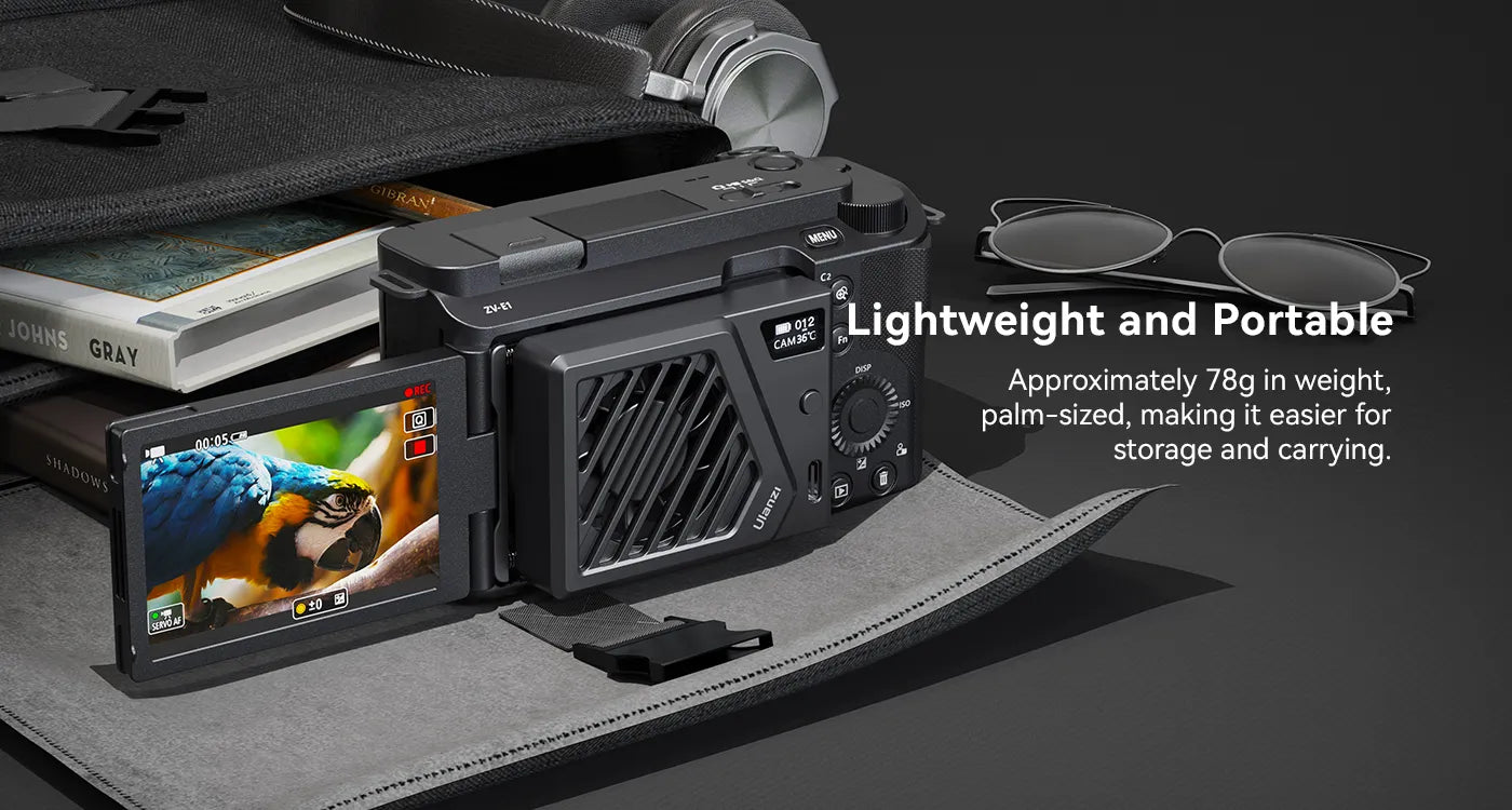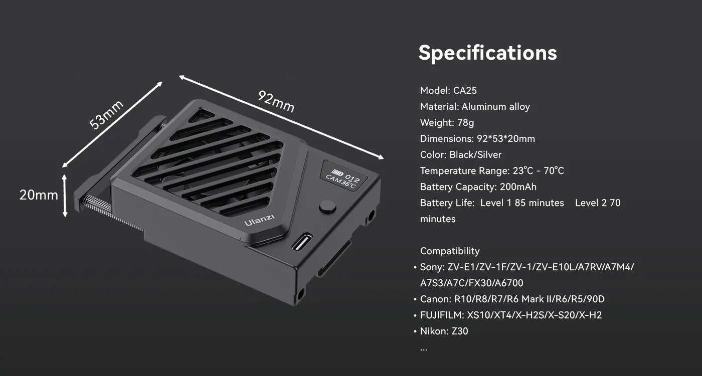 The Ulanzi CA25 Camera Cooling Fan is a fantastic investment, especially during the summer months when cameras can easily overheat during extended use. Designed for Sony, Canon, and FUJIFILM cameras, it effectively prevents overheating, ensuring your camera performs at its best even in hot conditions. It's a must-have accessory for maintaining optimal performance and avoiding potential issues caused by excessive heat during your photography sessions. Compatible with cameras such as Sony ZV-E1/ZV-1F/ZV-1/ZV-E10L/a7RV/a7 IV (A7M4)/a7S III (A7S3)/A7C/FX30/A6700, Canon R10/R8/R7/R6 Mark II/R5/90D, FUJIFILM XS10/XT4/X-H2S/X-S20/X-H2, Nikon Z30 and more.