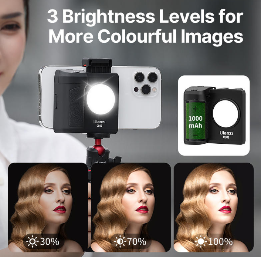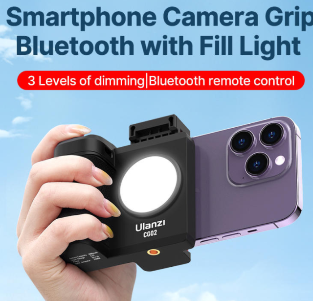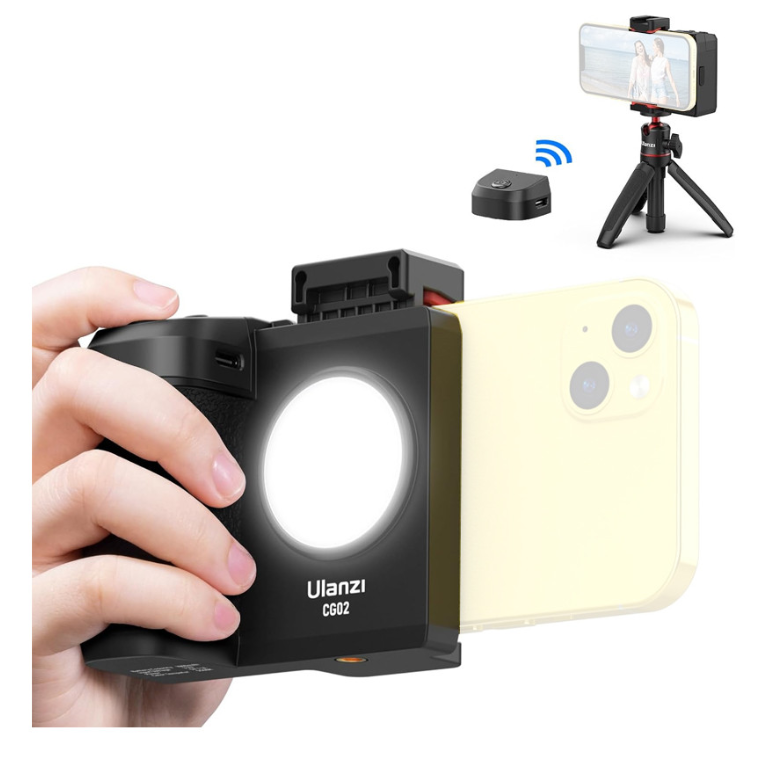 The Ulanzi CG-02 Smartphone Camera Grip is a versatile handheld grip with a built-in fill light and Bluetooth remote control. Designed for one-handed shooting, it improves stability, lighting, and control—making it ideal for vlogging, live streaming, and mobile photography.