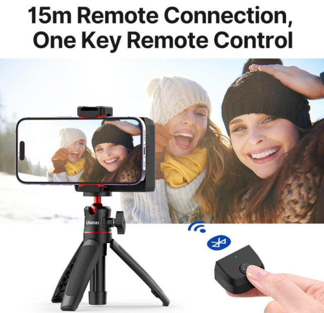 For added convenience, the grip includes a detachable Bluetooth remote control with a wireless range of up to 15 meters. It connects instantly to most smartphones without requiring any app downloads, making it easy to capture photos or start recording from a distance. The ergonomically shaped handle with a soft silicone finish provides enhanced stability and anti-shake performance while remaining comfortable for extended one-handed use.