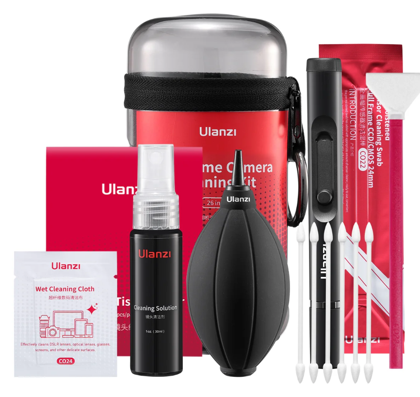 The Ulanzi CO28 26-in-1 Camera Cleaning Kit is a complete cleaning solution for full-frame cameras and precision optics. Packed with 26 essential tools in a compact case, it safely removes dust, fingerprints, smudges, and water spots—perfect for photographers and creators on the go.