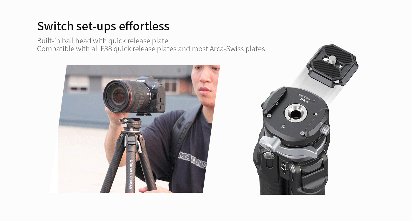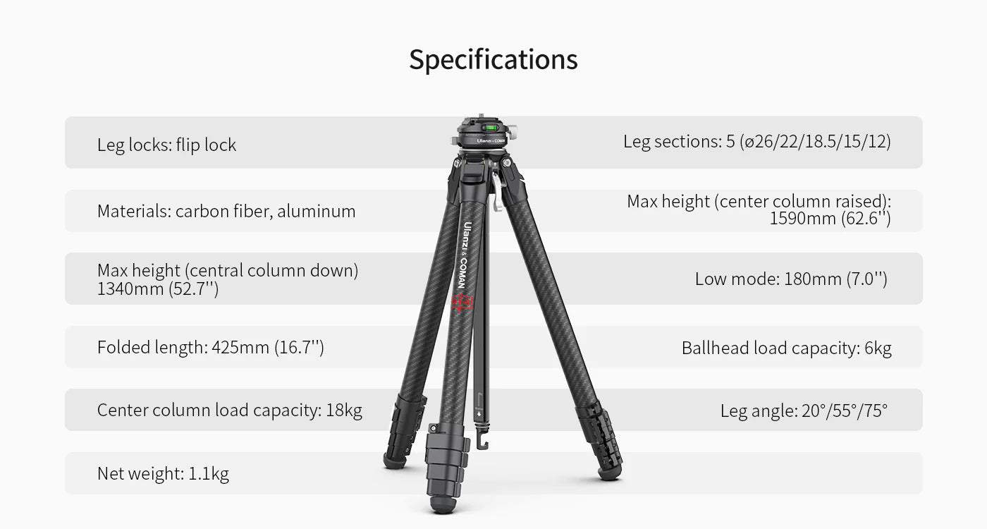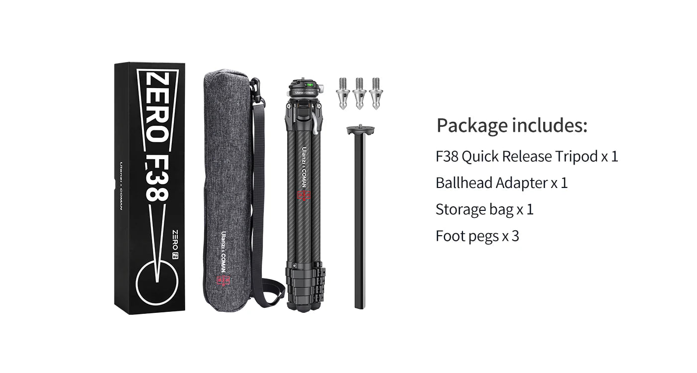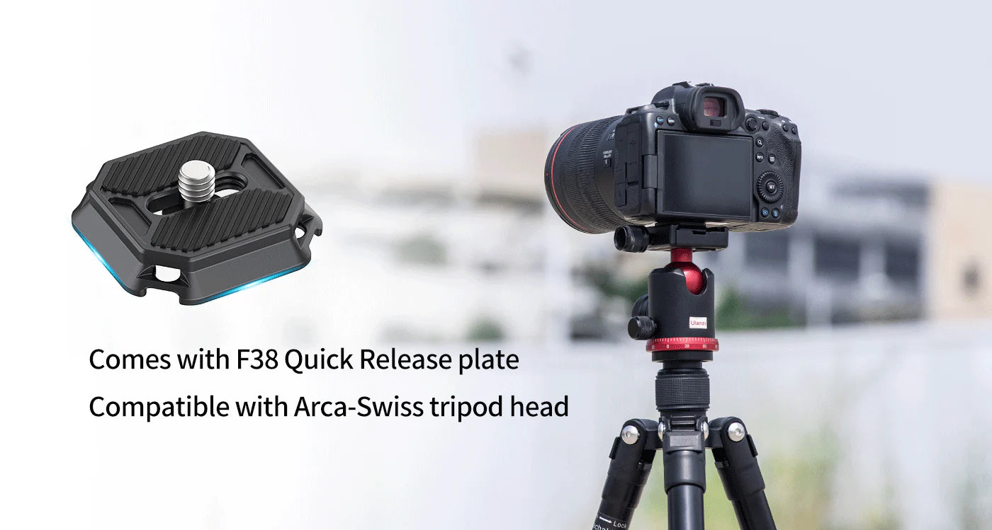 Ulanzi Zero F38 Quick Release Travel Tripod: Capture stunning visuals on the go with this compact and lightweight (1.1kg / 2.4 lbs) carbon fiber travel tripod. Effortlessly switch between setups thanks to the built-in ball head and F38 quick release plate, while the included extra center column offers Arca-Swiss compatibility for ultimate flexibility. Shoot from various angles with adjustable leg positions (20°/55°/75°) and a removable short column for low-angle shots. The Ulanzi Zero F38 is built to last, supporting up to 18kg / 39.6 lbs and featuring all-serviceable parts with a lifetime guarantee. Unleash your creativity and capture unforgettable moments wherever you wander!