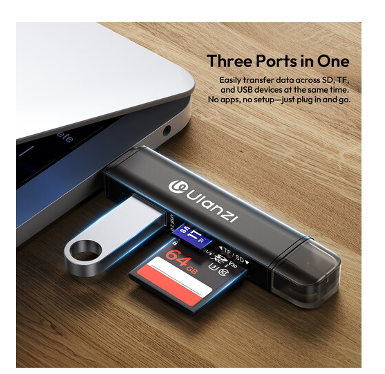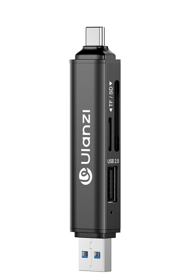 The Ulanzi CR1 3-in-1 Card Reader is an efficient and convenient tool for content creators, photographers, and anyone needing to transfer data between SD, microSD, and USB devices. This compact reader features both USB-C and USB-A 3.2 Gen 1 male interfaces, allowing you to easily connect to a wide range of devices, from phones and tablets to desktops and laptops. With data transfer speeds of up to 170 MB/s via USB 3.2 Gen 1, it ensures fast and efficient file transfers, making it ideal for photographers and videographers who need to quickly move large files.