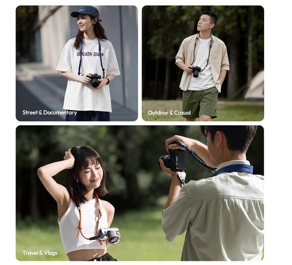 Its anti-tangle cylindrical connector system prevents twisting and knotting during movement, making it ideal for dynamic shooting environments such as travel, street photography, or event coverage. A quick-pull adjustment system allows easy length customization between 100–130 cm, ensuring a comfortable fit for different body types and carrying styles.