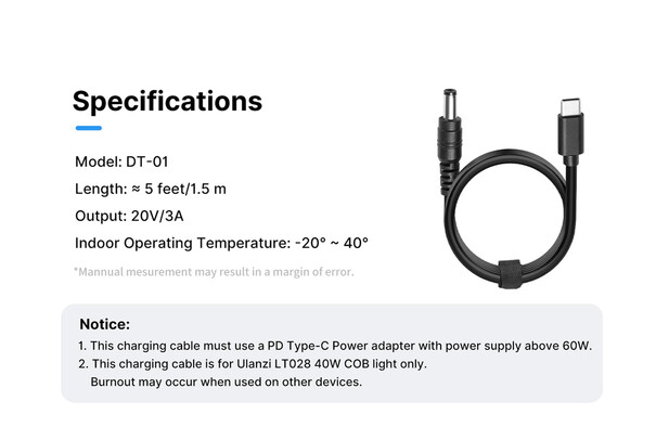 The Ulanzi L082GBB1 DC to USB-C Power Cable (5') is designed to power the Ulanzi LT028 Bi-Color LED Monolight using a USB-C power bank or adapter. With a 20V, 3A output, this durable 5-foot cable ensures efficient power delivery for your lighting setup.