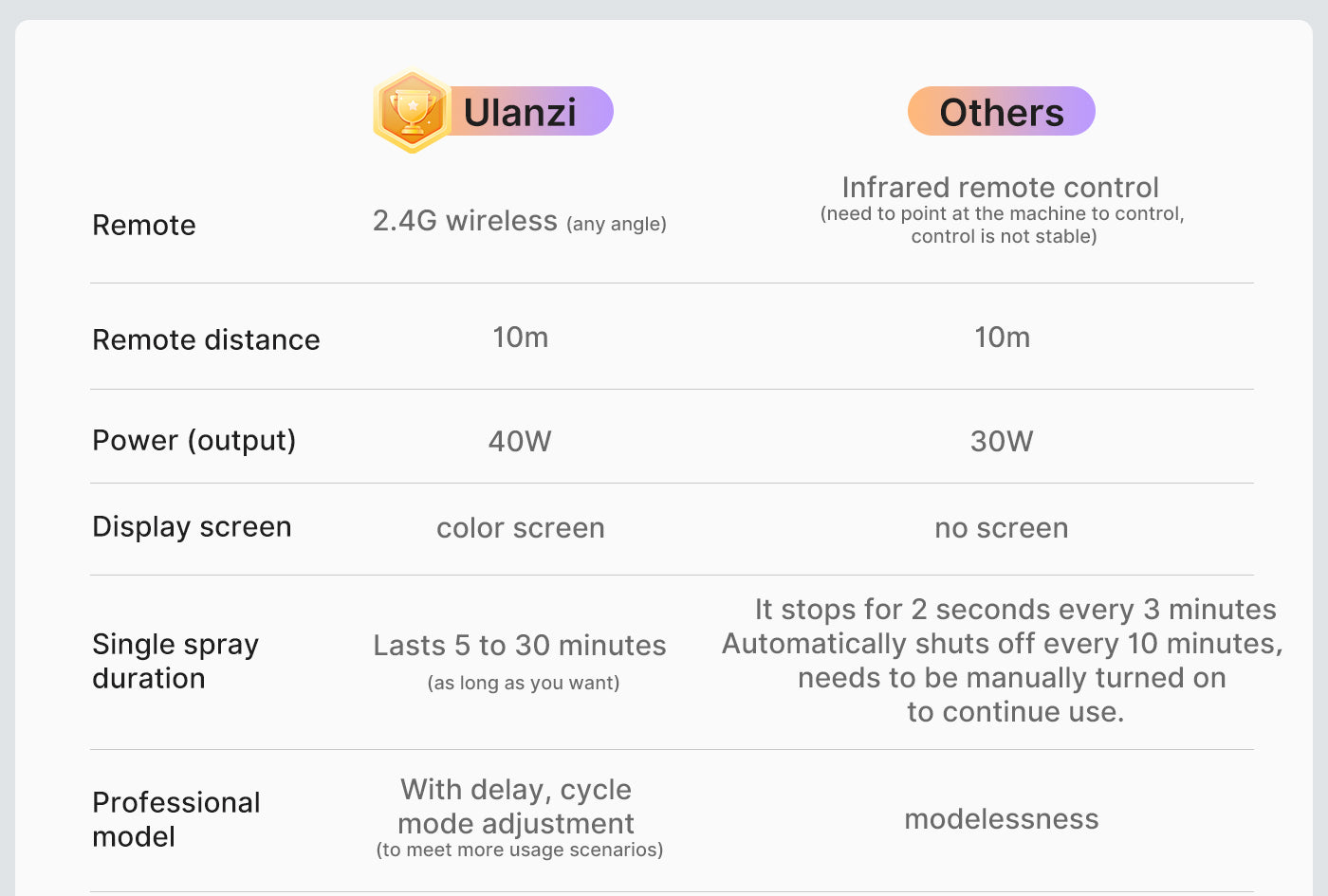 - Foggy spray, no fine dust