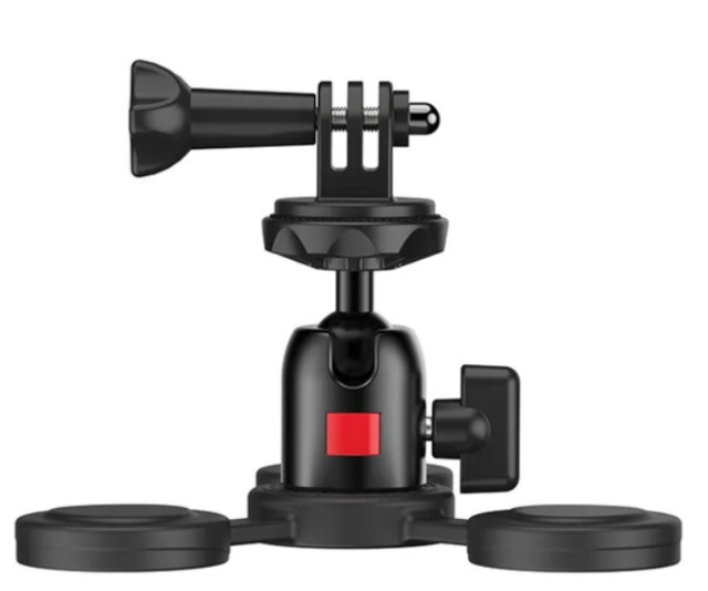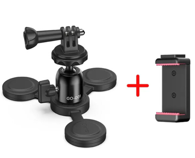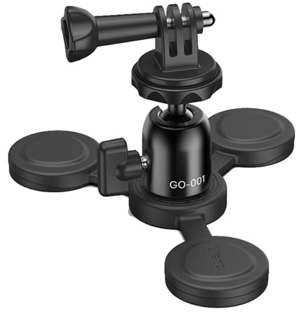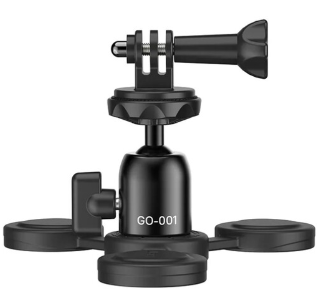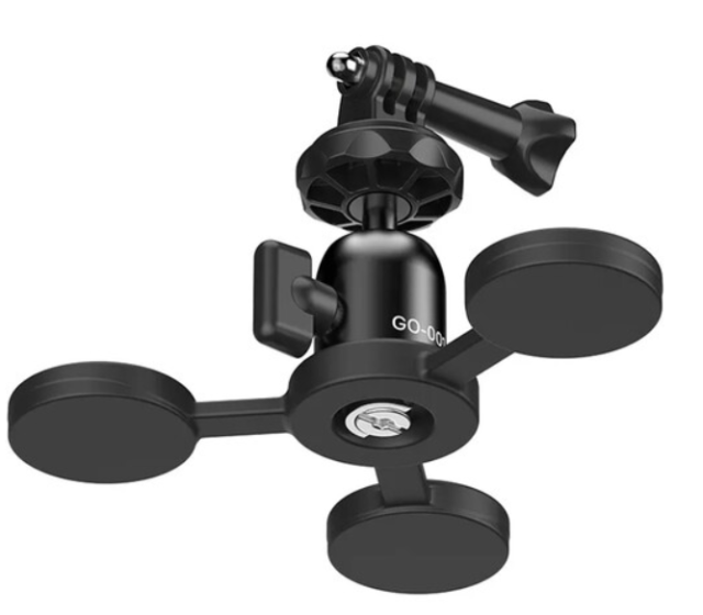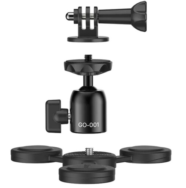 The Ulanzi GO-001 Magnetic Mount is a 9.4 oz (267 g) triangular action camera mount with four reinforced magnets (600 g load), 360° pan-tilt ball head, 1/4"-20 threading, and scratch-resistant silicone/aluminum construction—ensuring stable, flexible mounting on metal surfaces with quick portrait/landscape switching.
