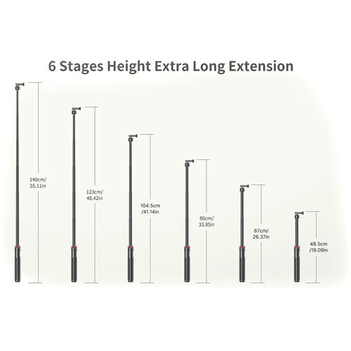 With six stages of extension, the Go-Quick II tripod can extend from 19.1" (48.5 cm) up to 55.1" (140 cm), allowing for high-angle shots or self-recording from a distance. When collapsed, it measures just 11.5" (29.3 cm), making it compact and travel-friendly. Constructed from ABS and aluminum, it is lightweight yet durable, weighing only 11.7 oz (332 g). Ideal for vlogging, action sports, live streaming, and outdoor filming, this tripod provides stability, portability, and versatility for any shooting scenario.