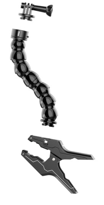 The Ulanzi Go-Quick II is a 210 g pocketable flexible arm with spring-loaded 5–50 mm C-clamp, 189 mm 360° steel gooseneck, universal 3-prong action-cam mount (GoPro/DJI/Insta360), dual 1/4"-20 threads, non-slip silicone pads, and 2 kg payload—enabling stable, adjustable positioning for action cams, mics, or lights in compact setups.
