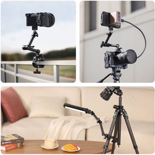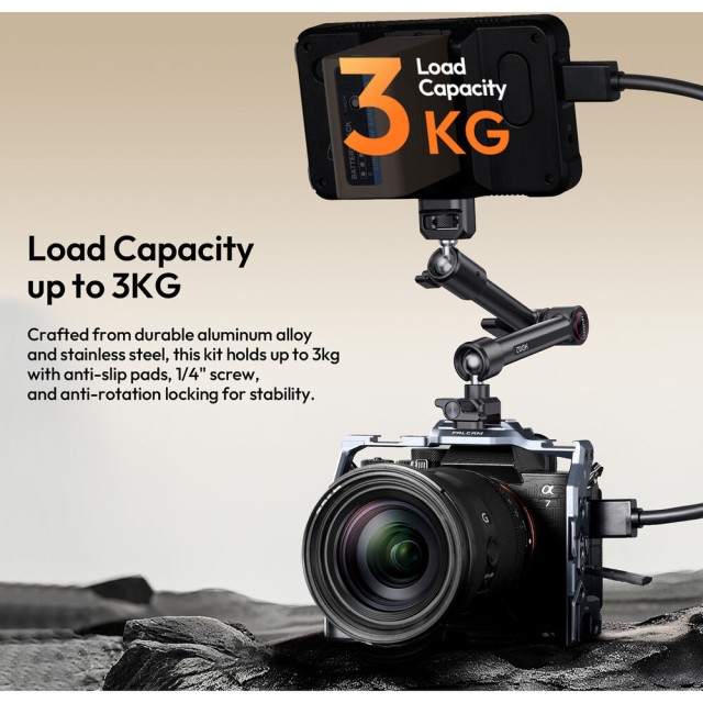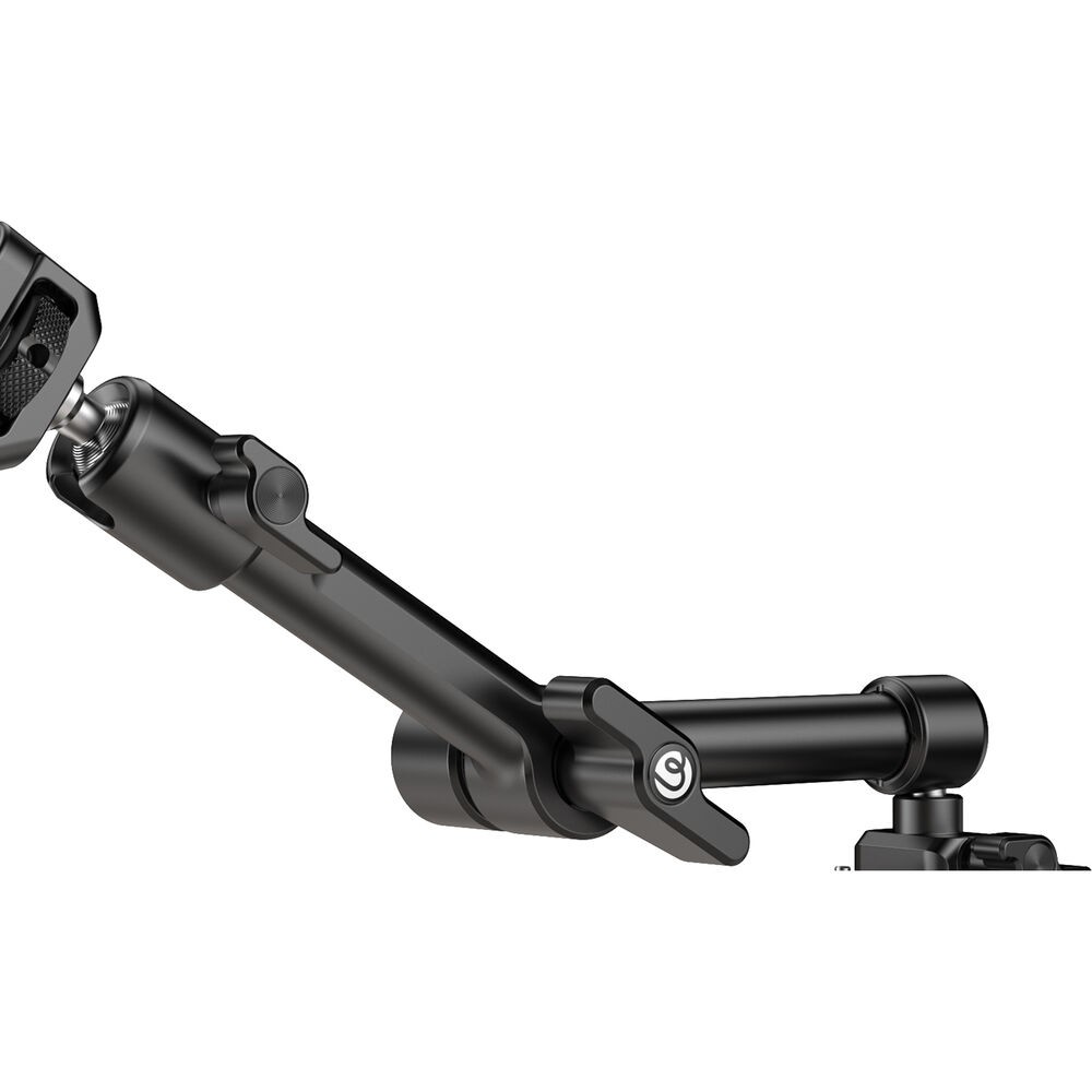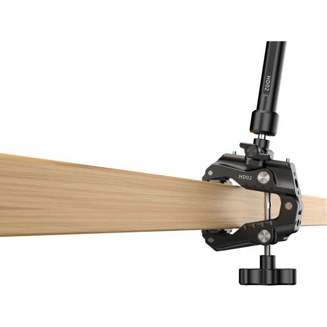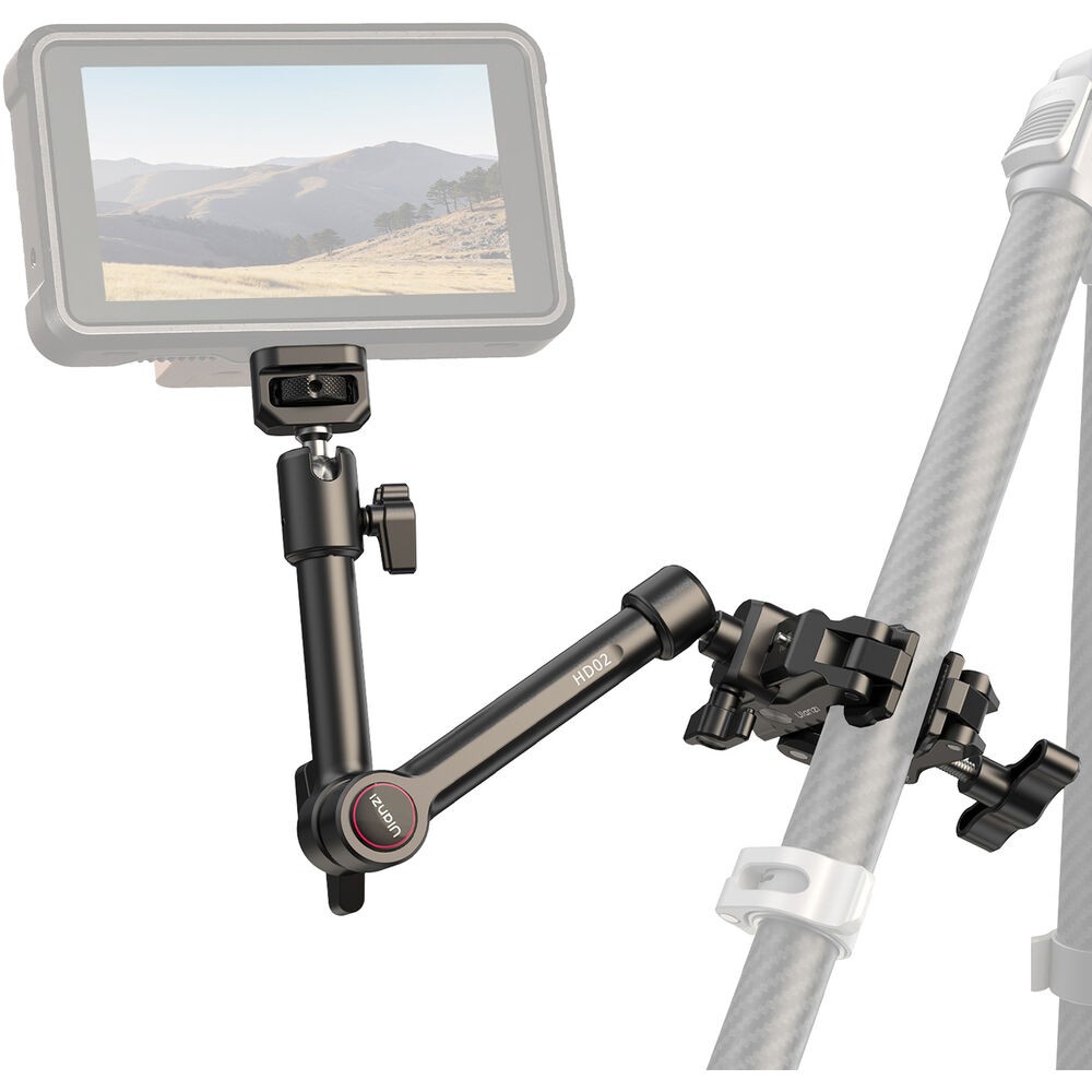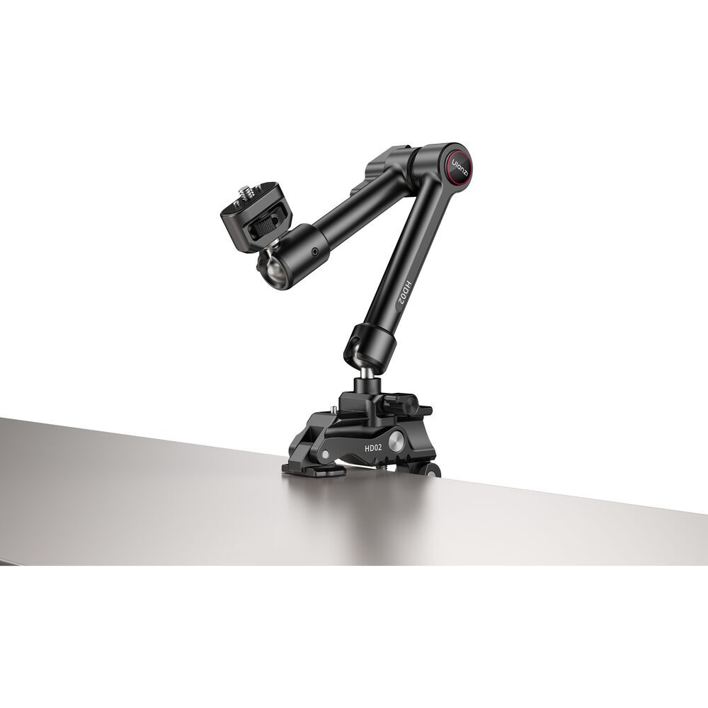 The HD02 Magic Arm with Crab Clamp from Ulanzi is a 10" magic arm with a 6.6 lb load capacity. Mount cameras, lights, or other accessories using the 1/4"-20 screw with ARRI locating pins, or 1/4"-20 and 3/8"-16 thread holes. Attach the arm to surfaces between 0.86 and 3.4" thick using the included clamp with nonslip pads, and it's simple to adjust the angle once mounted thanks to the 360° ball head on each end and the 360° rotation between the two arm sections.