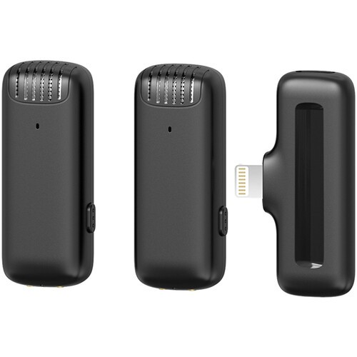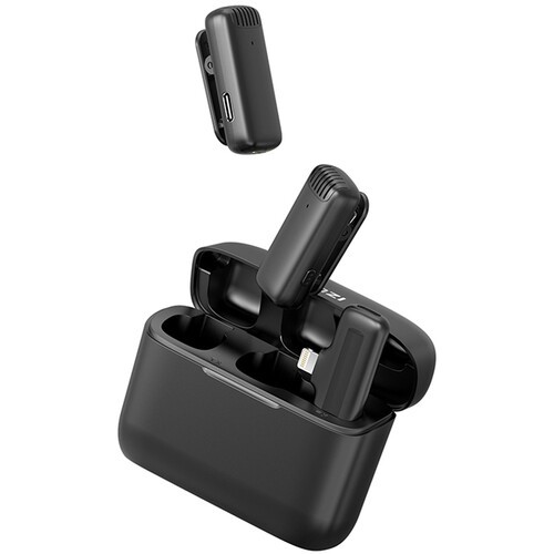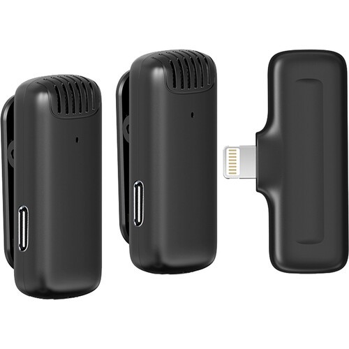 Operating on the 2.4 GHz frequency band, the transmitters maintain a stable connection up to 65.6 ft (20 m) from the receiver. Integrated de-noise technology filters ambient sounds, providing clean, intelligible audio even in noisy environments. Each transmitter offers 6–7 hours of battery life, while the receiver draws power from the connected iOS device and can be charged simultaneously via the included port. The charging case allows up to 5 full recharges, extending recording sessions for all-day shoots without interruptions.