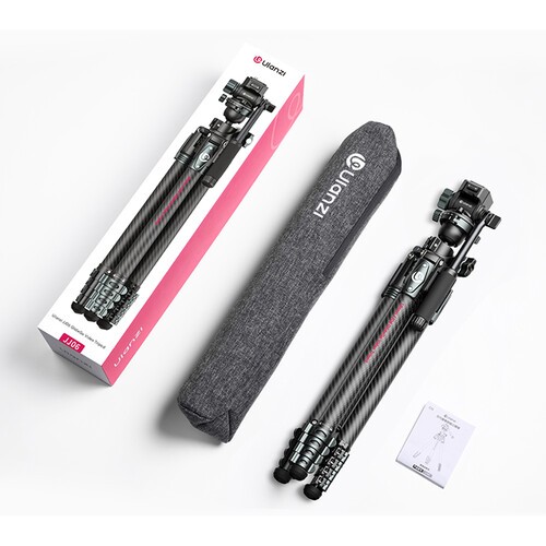 Engineered for content creators, videographers, and photographers, the Ulanzi JJ06 Overhead Travel Tripod combines portability, strength, and advanced functionality. Constructed with five-section carbon fiber legs, this tripod supports up to 39.7 lb of equipment, while its fluid ball head holds up to 11 lb for smooth, precise adjustments. The split center column allows low-angle shooting and includes a ballast hook for added stability. With leg angle positions of 22°, 55°, and 80° and independent pan and tilt locks, the JJ06 provides versatile camera positioning for any scenario, including overhead shots, tabletop setups, and dynamic vlogging. The tripod folds down to 51.5 cm, making it travel-friendly, and includes an Arca-type quick release plate, pan handle, multi-head tool, and carrying bag for complete functionality on the go. Anti-twist 1/4"-20 threaded accessory holes and a bubble level ensure precise alignment and accessory compatibility.