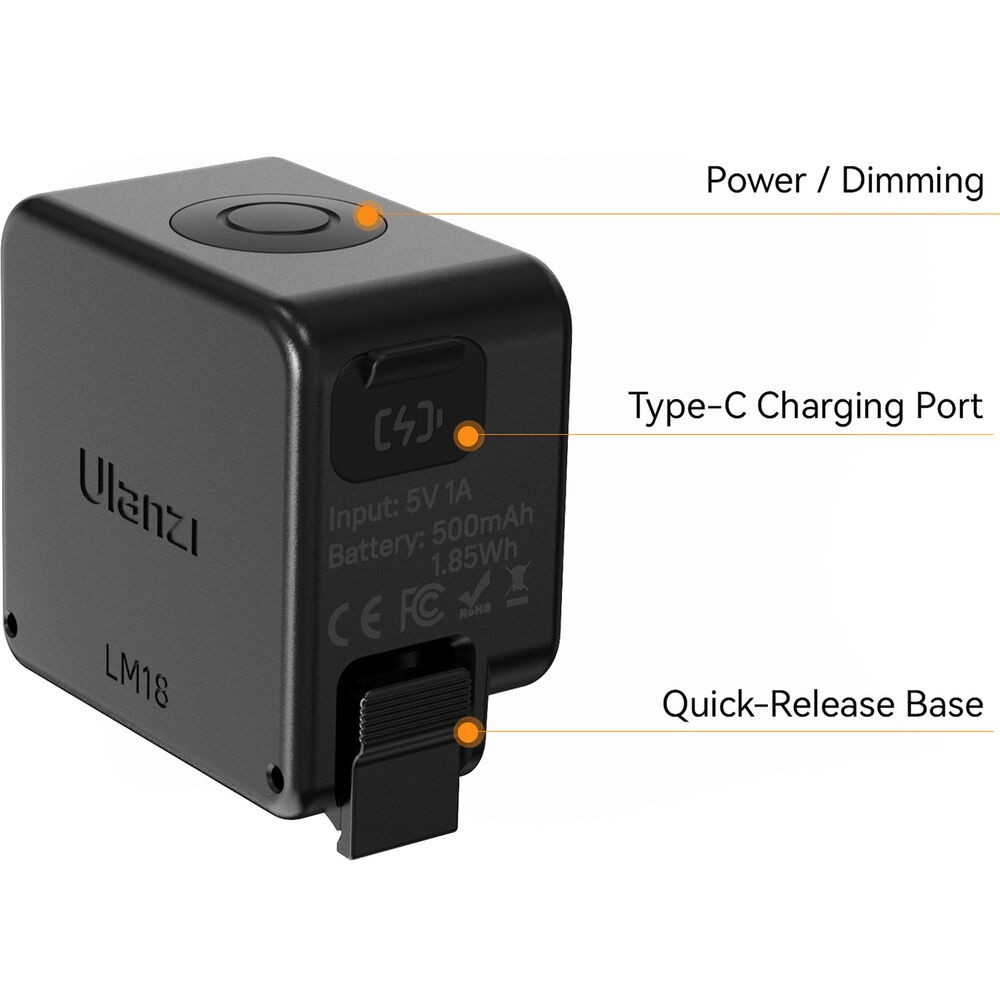Powered by a built-in 500 mAh rechargeable battery, the LM18 can run from 1 hour at maximum brightness to up to 8 hours at minimum output. The light is fully USB rechargeable and comes with a USB charging cable. Its durable, lightweight design includes an IPX5 waterproof rating for use in rain or wet conditions, while the DJI quick release mounting clip allows easy attachment to your Osmo Action or Pocket cameras. The LM18 is ideal for vloggers, content creators, and action shooters looking for a portable, reliable fill light.