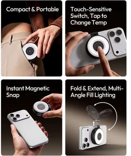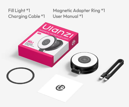 The Ulanzi LM21 Magnetic Fill Light (Black) is a compact and portable MagSafe-compatible mini ring light designed for mobile photography and content creation. With adjustable color temperatures, high CRI for accurate color rendering, and a lightweight foldable design, it delivers soft, natural lighting for selfies, video calls, and on-the-go shooting.