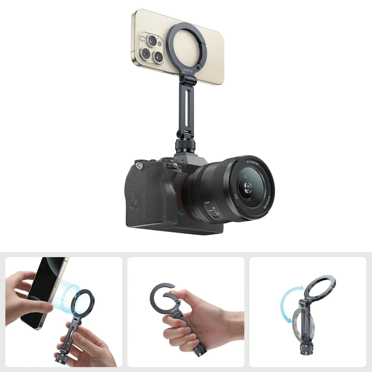 The Ulanzi MA07 MagLock 1/4 Cold Shoe Bracket is a versatile, foldable phone stand and accessory mount featuring one-handed MagSafe snap-on, smooth rotation and tilt, and universal 1/4"-20 and cold shoe compatibility. Compact, lightweight, and travel-ready, it’s ideal for live streaming, interviews, dual-screen shooting, and creative mobile setups.