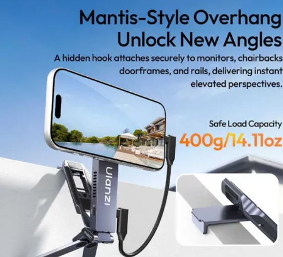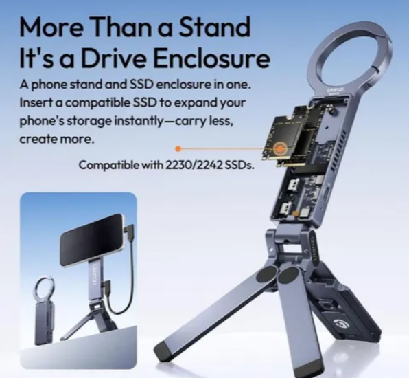 The Ulanzi MA58 MagLock SSD Enclosure with Phone Stand is a multifunctional mobile creator accessory that combines a MagSafe-compatible phone stand with an external SSD enclosure for instant storage expansion. Built from durable aluminum, it supports 2230 and 2242 SSDs, allowing users to record, transfer, and store large files directly from their phone setup. With a 400g load capacity and a built-in hook design, it also enables flexible mounting on monitors, rails, chairs, and other surfaces for elevated shooting angles.