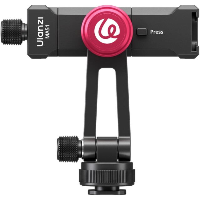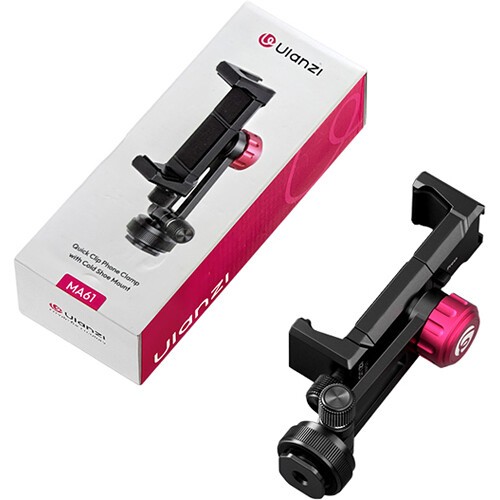 The Ulanzi MA61 QuickClip is a versatile phone clamp that fits smartphones 2.6–3.5" wide, offering 180° tilt, 360° rotation, a locking cold shoe base, 1/4"-20 mount, and dual cold shoe accessory mounts for expanded rig setups.
