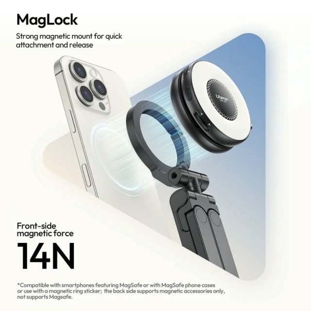 The Ulanzi MA88 MagLock Phone Holder Tripod is a portable and multifunctional phone mount designed for mobile creators, streamers, and vloggers. Featuring a patented dual-side MagLock design, it allows instant magnetic attachment to MagSafe-compatible phones or cases. The strong magnetic force ensures a secure grip without slipping or shaking.