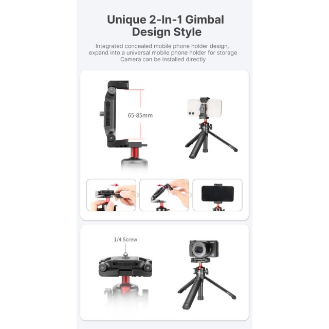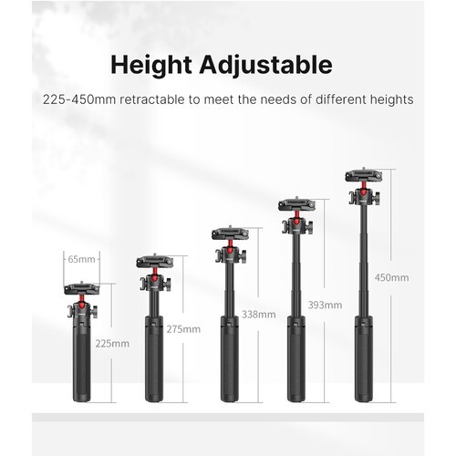 The Ulanzi MT-41 4-Section Telescopic Mini Tripod V2 is designed for creators who need versatility in a compact form factor. This tabletop tripod features a telescopic center column that extends up to 17.7 inches (45 cm), allowing it to function both as a stable mini tripod and a convenient handheld selfie stick. Its integrated ball head provides smooth manual adjustment with up to 90° vertical tilt, enabling easy switching between horizontal and vertical shooting.