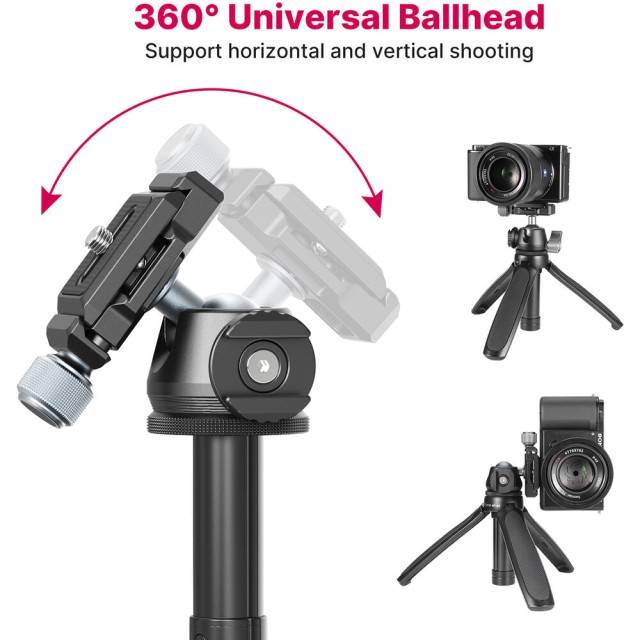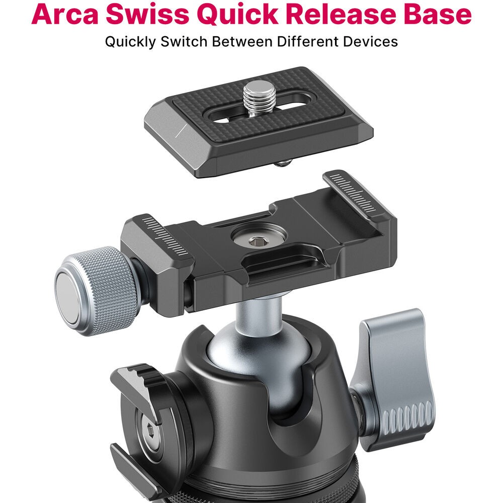 The integrated ball head allows smooth 360° panoramic rotation and 90° vertical tilt, enabling quick transitions between landscape and portrait orientations. A single locking lever makes adjustments fast and intuitive. The standout feature is the slim Arca-type quick release plate, which allows rapid mounting and removal of your camera without tools. Additionally, the rotating cold shoe mount lets you attach accessories such as microphones, LED lights, or monitors to build a compact, professional shooting rig.