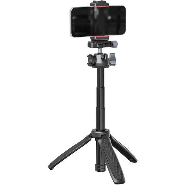 The tripod legs open to provide stable tabletop support with rubber-tipped feet that enhance grip and protect surfaces. When folded, the legs form an ergonomic handheld grip with an anti-slip surface, allowing the MT-47 to be used comfortably as a vlogging handle or selfie stick. With a maximum working height of 14.6 inches (37.2 cm), it’s ideal for desk setups, low-angle shots, or handheld shooting.