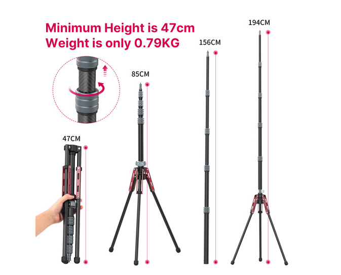 The Ulanzi MT-49 Carbon Fiber Portable Light Stand / Camera Tripod (1.9m) is a lightweight yet durable support solution designed for photographers and videographers on the go. Featuring a carbon fiber build, it supports up to 6 kg while extending to 1.94m, and folds down compactly for easy transport. With a detachable center column that converts into a monopod, it offers excellent versatility for both studio and outdoor shooting.