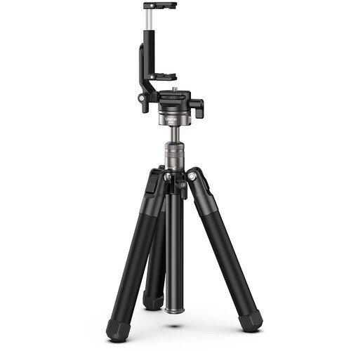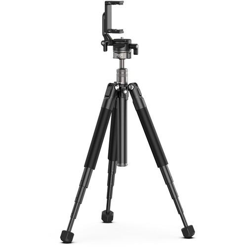 The integrated ball head delivers smooth movement with 360° panoramic panning, drag control, and independent pan locking, enabling precise framing in both horizontal and vertical orientations. A built-in smartphone adapter and standard 1/4"-20 mounting screw ensure wide device compatibility. The removable and reversible center column doubles as a selfie stick, extending reach for handheld vlogging or creative angles. Additional features such as a bubble level, multiple leg angle positions, and non-slip foot pads enhance stability and ease of use across different shooting environments.