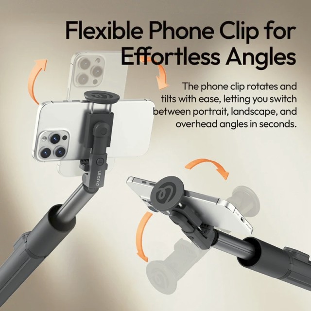 The Ulanzi MT86 Automatic Phone Tripod is a professional yet compact tripod engineered for mobile content creators, vloggers, and selfie enthusiasts. Weighing just 385 g, it’s lighter than a standard 360 ml water bottle, making it perfect for on-the-go use. Its upgraded four-leg design with non-slip pads provides stability on any surface, while the 8-section extendable legs allow a maximum height of 1.53 m in tripod mode or 1.5 m in selfie stick mode. The phone clamp supports devices 5.6–9.2 cm wide, rotating ±90° and tilting up to 90°, allowing quick switching between portrait, landscape, and overhead angles. A built-in cold shoe mount enables the attachment of small lights or microphones for enhanced content creation. The tripod comes with a detachable Bluetooth remote with a 10 m range, making it easy to take photos or record videos without touching your phone. Its folded size of 32.5 cm and automatic leg opening mechanism ensures setup is effortless—just place it down and the legs snap into position. Compatible with iOS, Android, and HarmonyOS, the MT86 is a versatile tripod for any mobile shooting scenario.