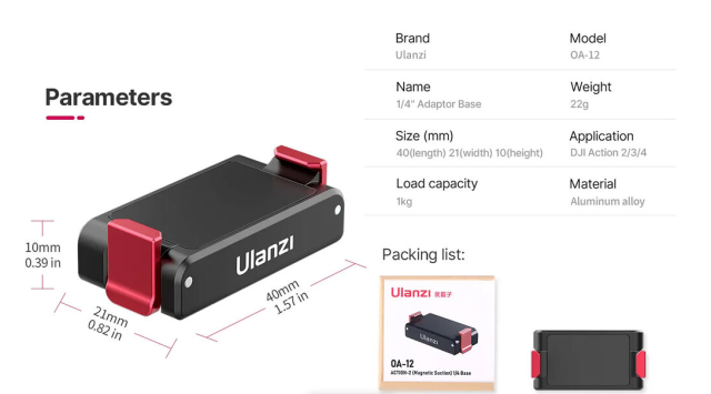 The Ulanzi Magnetic 1/4"-20 Base for DJI Action 2, 3 & 4 is a compact and reliable mounting solution designed to expand the versatility of your DJI Action camera. Featuring a strong magnetic base combined with two locking clips, it ensures a secure connection while allowing quick attachment and removal during fast-paced shooting.