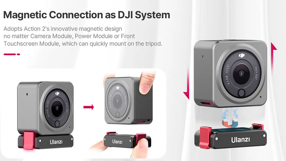 The Ulanzi 2846A Magnetic 1/4"-20 Base adds fast, secure magnetic mounting to DJI Action 2, 3, and 4 cameras, allowing easy attachment to tripods, magic arms, and other supports.
