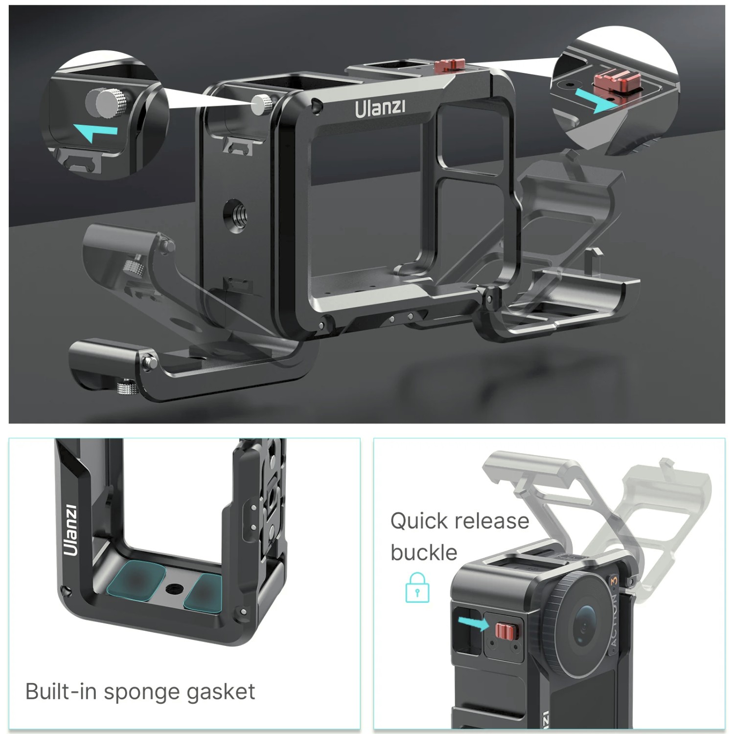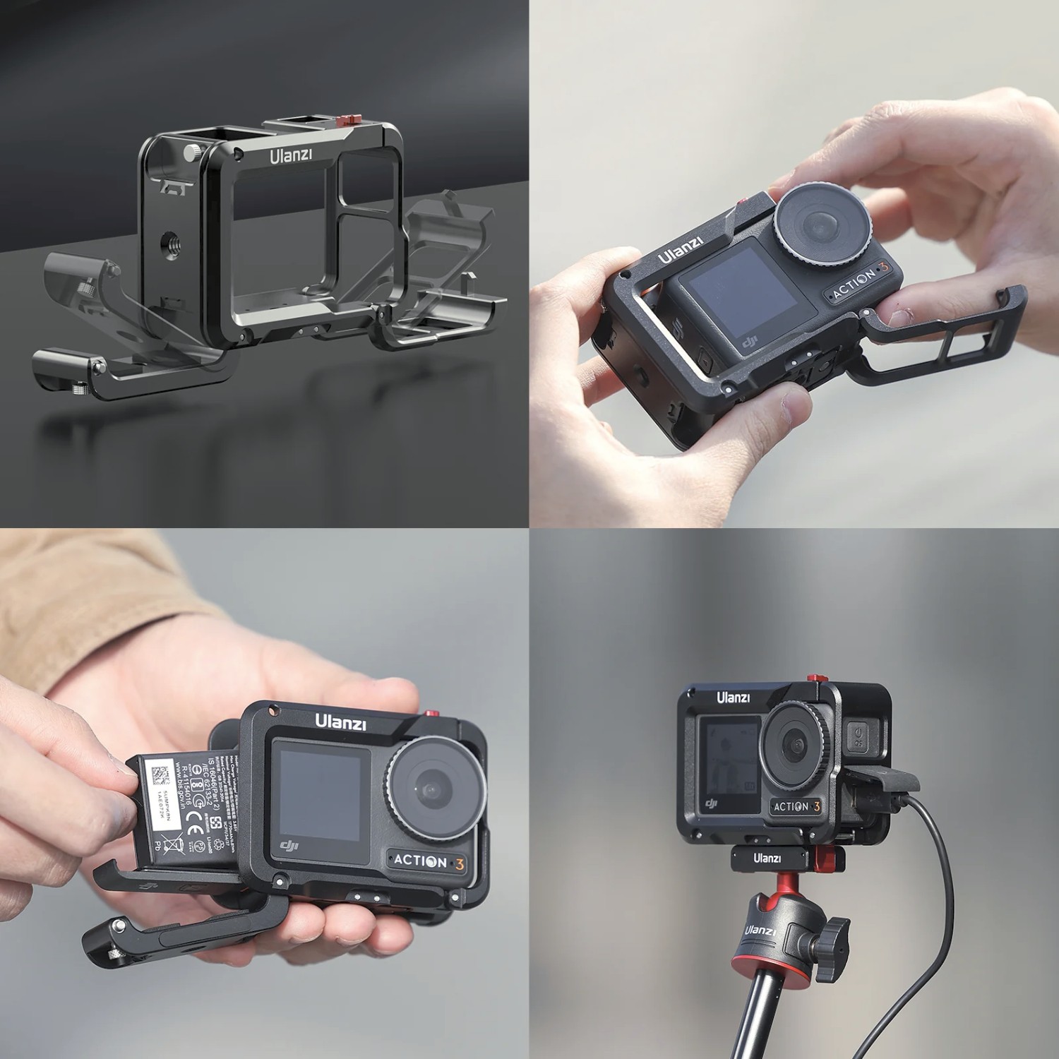The Ulanzi OA-14 C-Action Metal Camera Cage is a rugged and versatile cage designed for the DJI Osmo Action 3 and Action 4. It provides multiple mounting options for microphones, lights, and other accessories while allowing easy switching between horizontal and vertical shooting modes.
