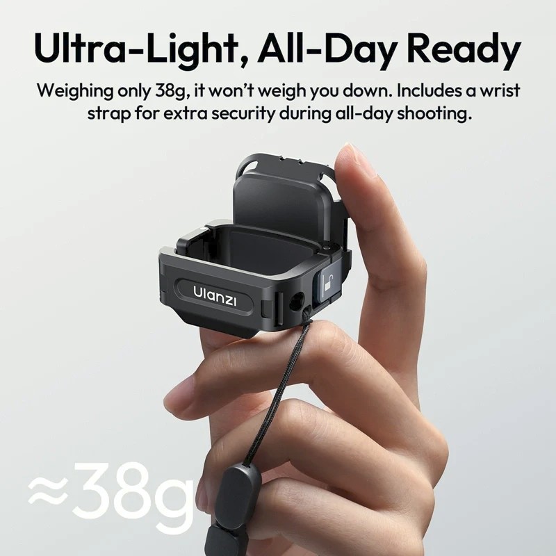 The adapter features universal 1/4" threading and GoPro mount compatibility, giving you flexibility to connect your Pocket 3 to tripods, mini tripods, shoulder rigs, or backpacks for hands-free shooting. Despite its robust build with CNC aluminum alloy, the PK13 weighs just 38 g, making it ultra-light and travel-friendly. The design preserves full access to your screen, joystick, memory card, and battery grip, while supporting original protective cases. A wrist strap adds extra security during active shooting, and the included wrench and screws ensure quick assembly.