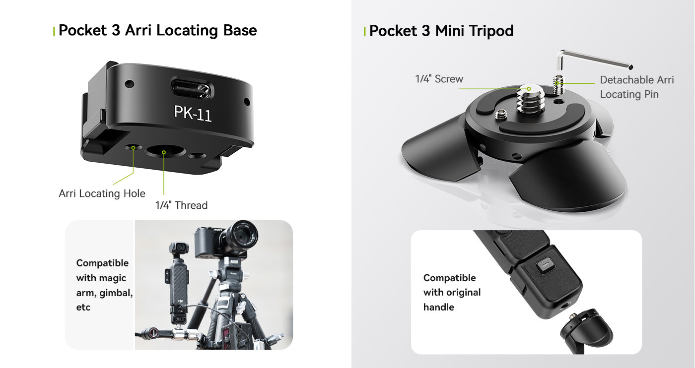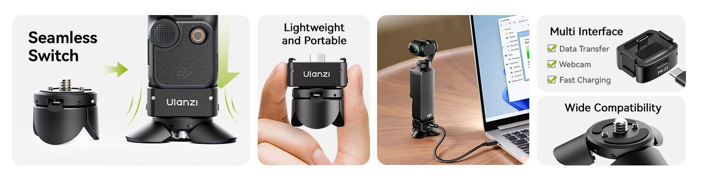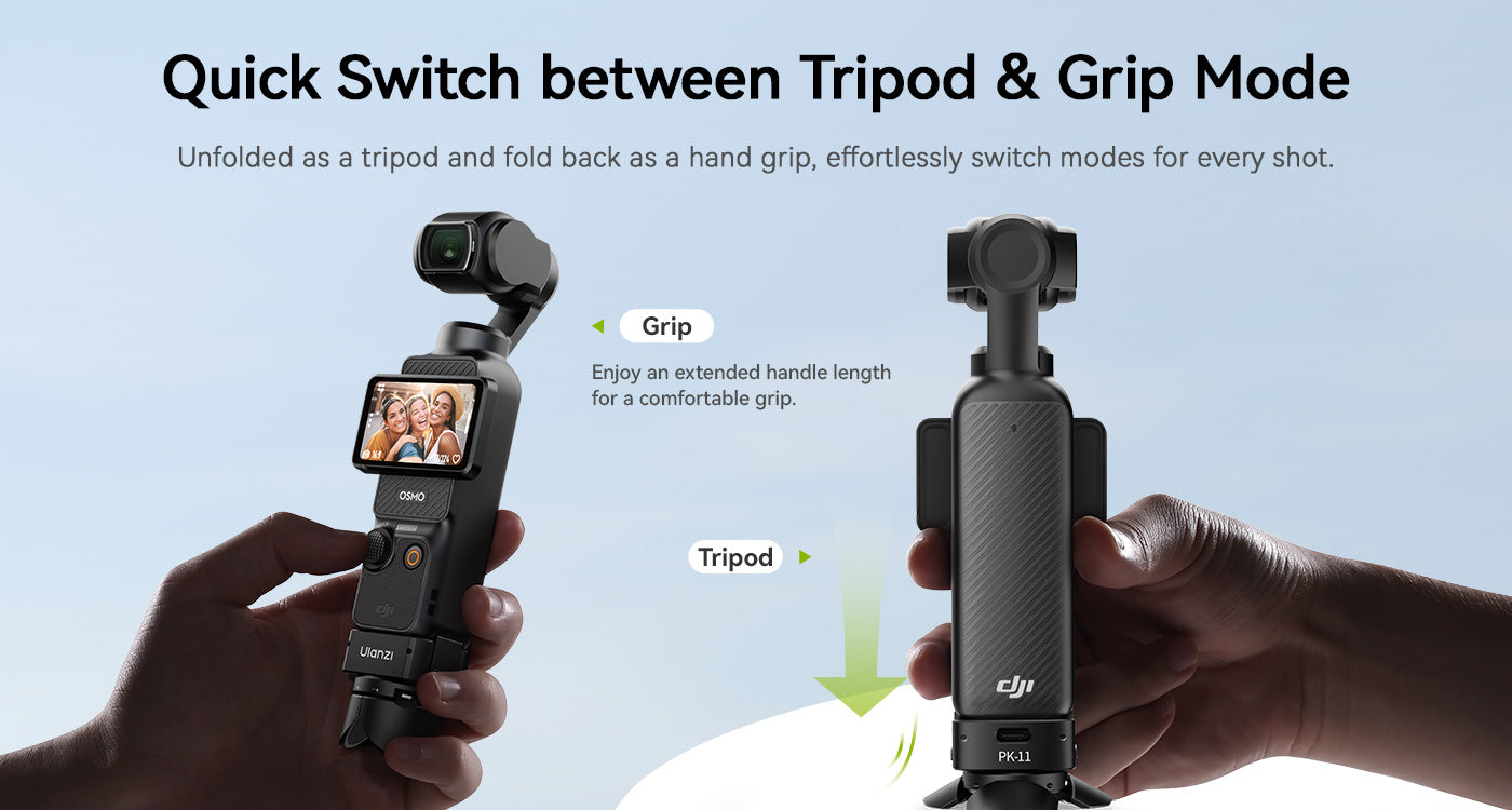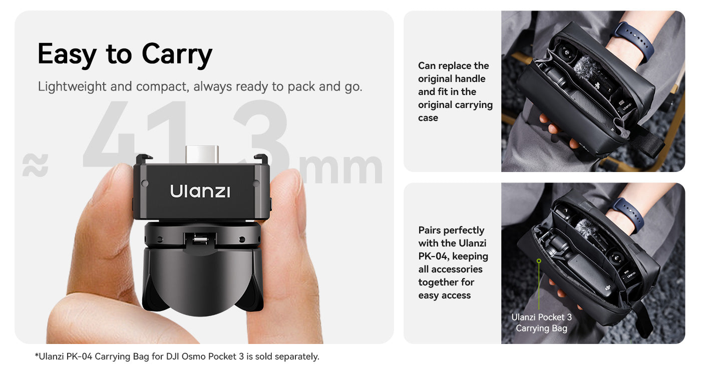 Ulanzi Pocket3 Mini Tripod is the perfect compact companion for DJI Osmo Pocket 3 users seeking stability and flexibility on the go. With a lightweight design and multi-mode functionality, it easily switches between tripod and handheld grip modes. The integrated 1/4" screw and detachable Arri locating pin ensure wide compatibility with accessories, while the full-function Type-C data port supports charging during use. Ideal for travel, vlogging, and tabletop shooting, this mini tripod delivers pro-level performance in a pocket-sized package