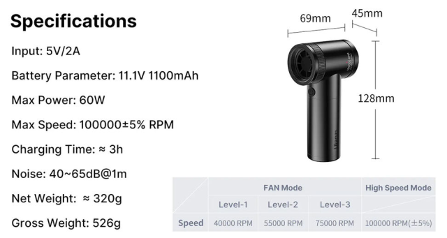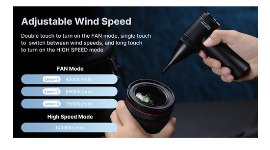 Equipped with four adjustable speed settings, the air duster allows precise control for different cleaning tasks—from delicate camera gear to keyboards, PC components, and desk setups. The powerful motor delivers rotation speeds ranging from 40,000 to 100,000 RPM, ensuring effective cleaning performance.