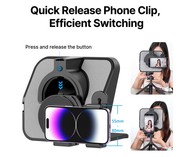 Supporting smartphones from 2.1 to 3.1 inches wide and tablets up to 6 inches, the RT02 mounts directly onto DSLR or mirrorless camera lenses using one of the five included adapter rings. It can also be used with smartphones via the included quick-release phone clip, making it suitable for both camera-based and mobile shooting setups.