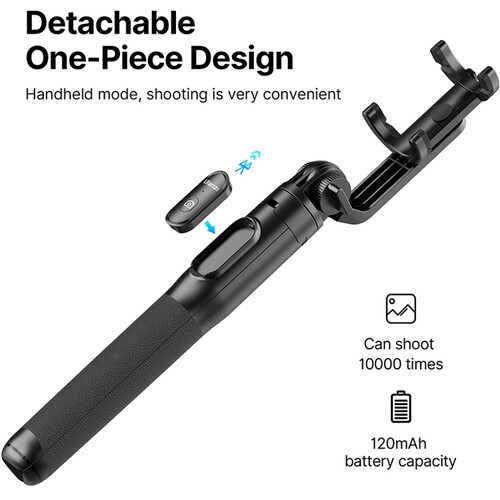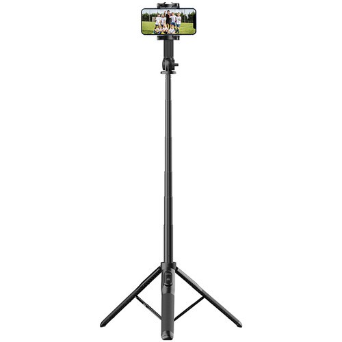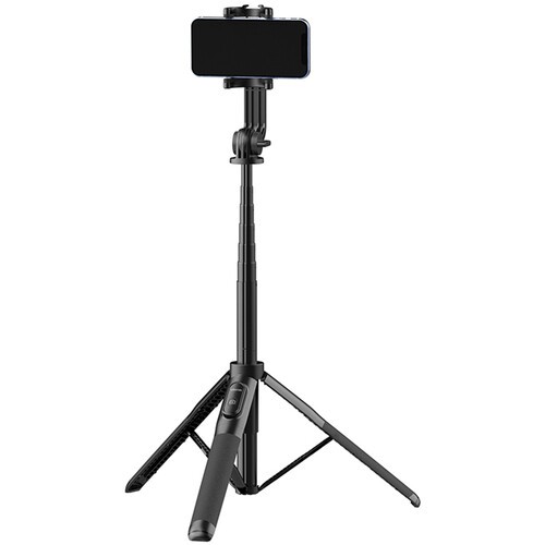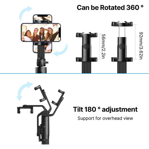 The adjustable phone holder supports devices 2.2–3.6" wide, offering 360° rotation and 180° tilt for portrait, landscape, or overhead shots. A cold shoe mount on top allows attachment of LED lights or microphones for enhanced video quality. Transforming the SK-03 from a handgrip to a tripod or a selfie stick is quick and easy. When collapsed, it measures just 12" (30.5 cm), making it ideal for travel and on-the-go content creation. Durable aluminum construction ensures stability and long-lasting use.