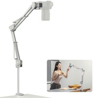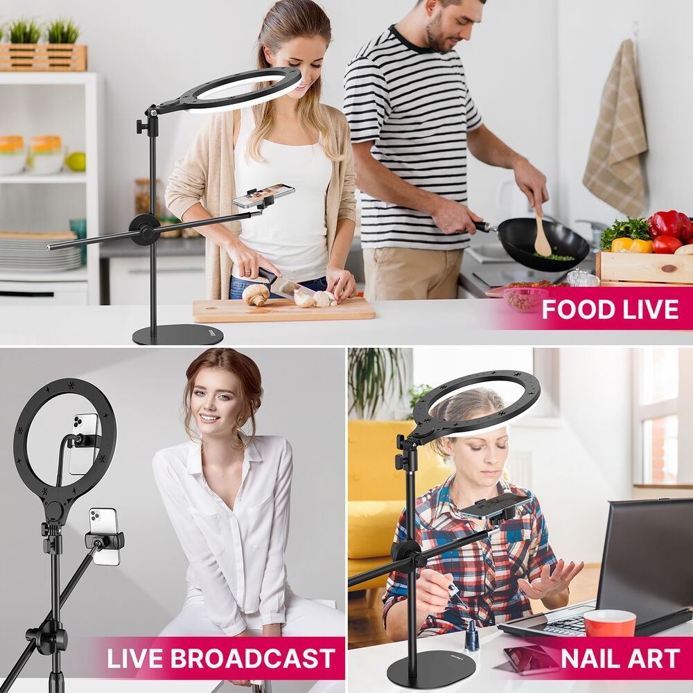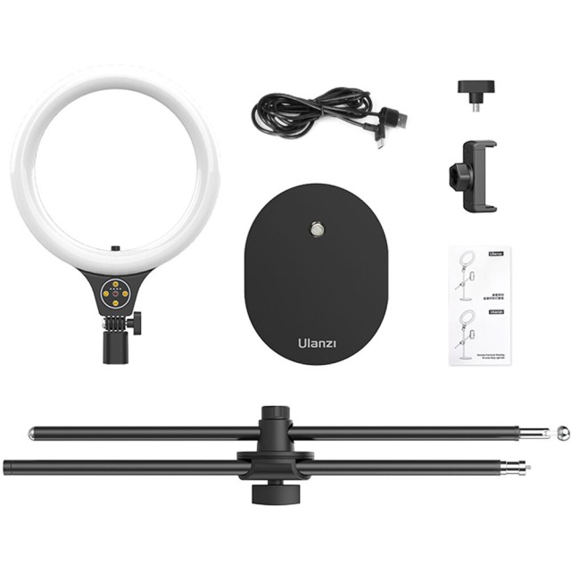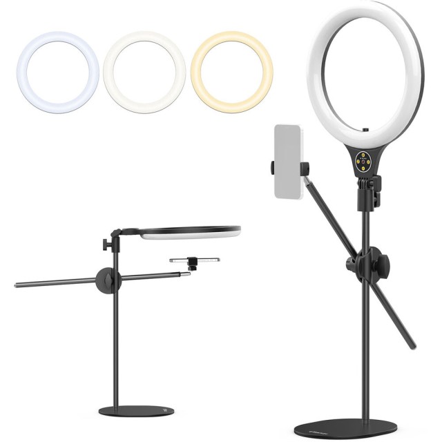 The Ulanzi T1 Overhead Ring Light Set is a 10-inch LED ring light with adjustable height up to 32" for overhead illumination. Featuring 3500–6500K color temperature, 11 brightness levels, and a built-in phone holder, it’s ideal for food, beauty, and fashion vlogs or desktop content creation.