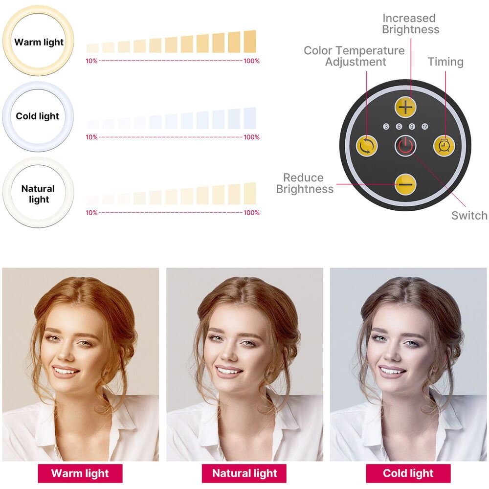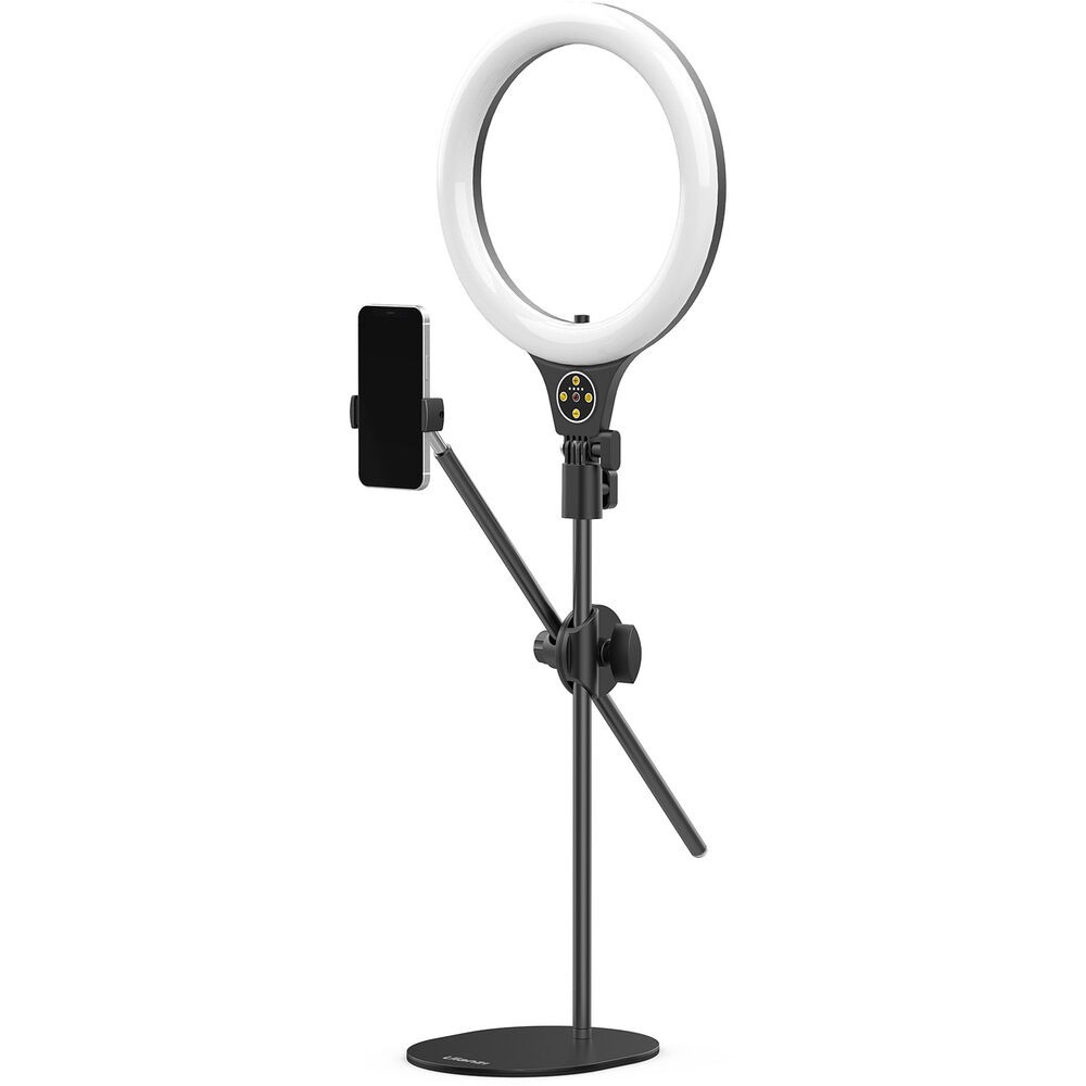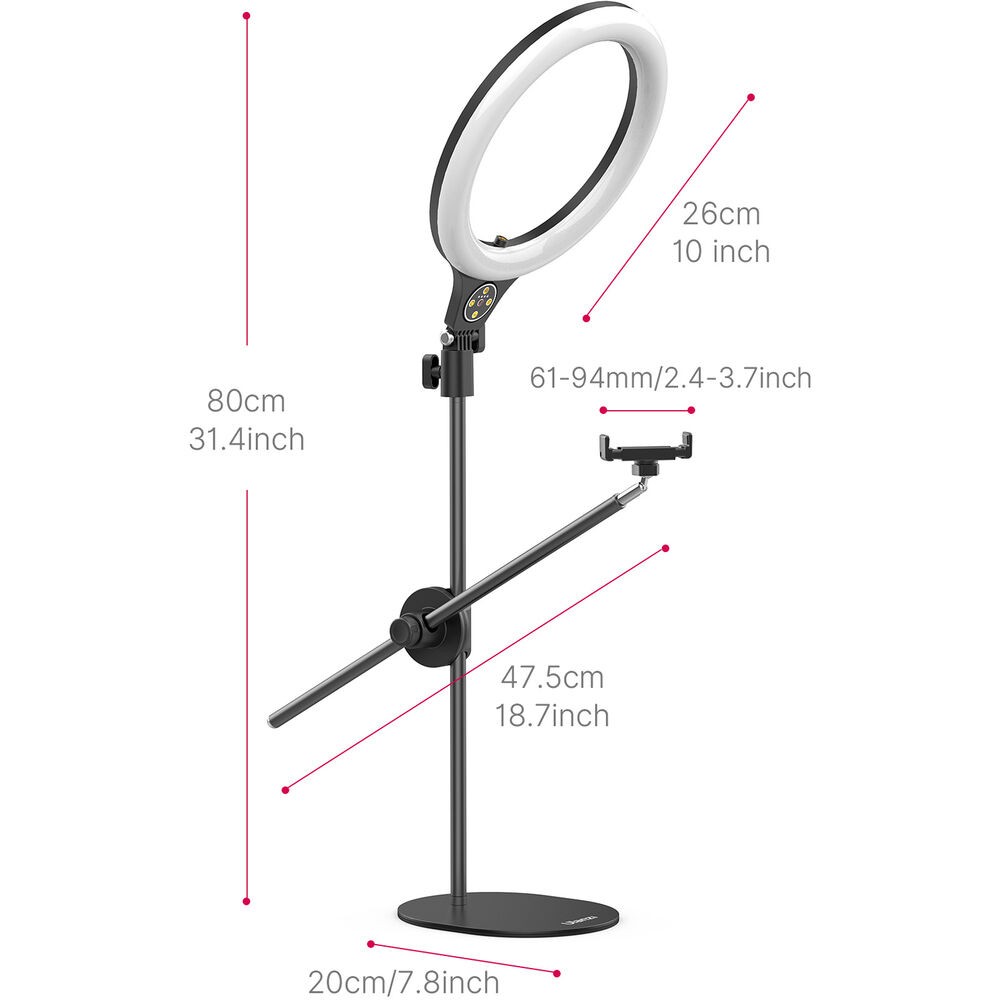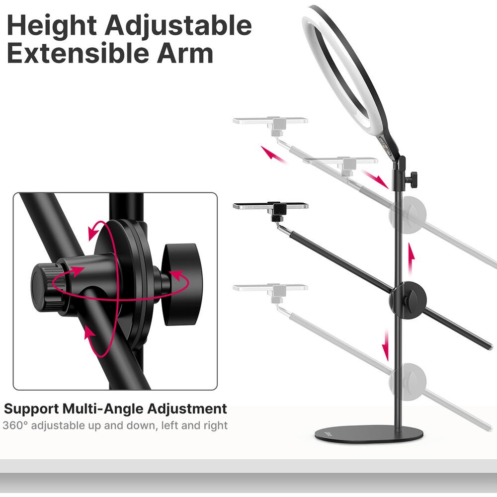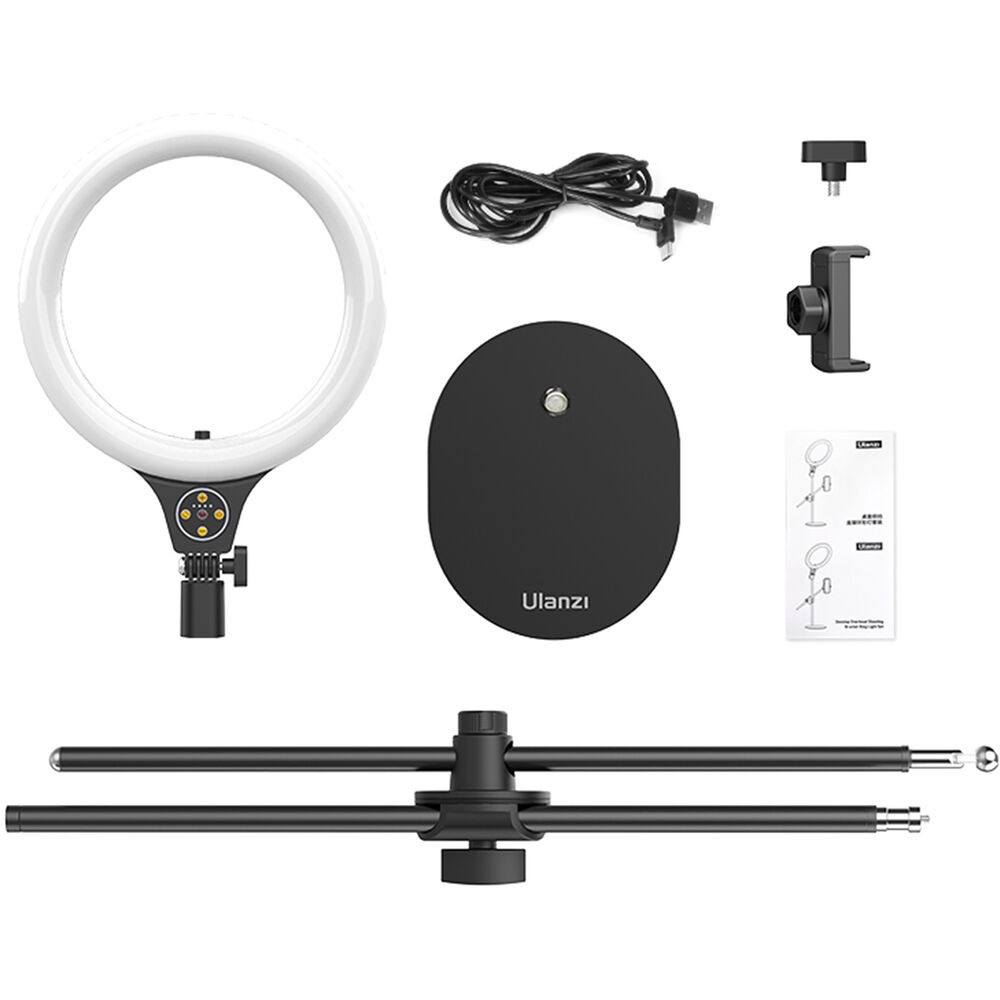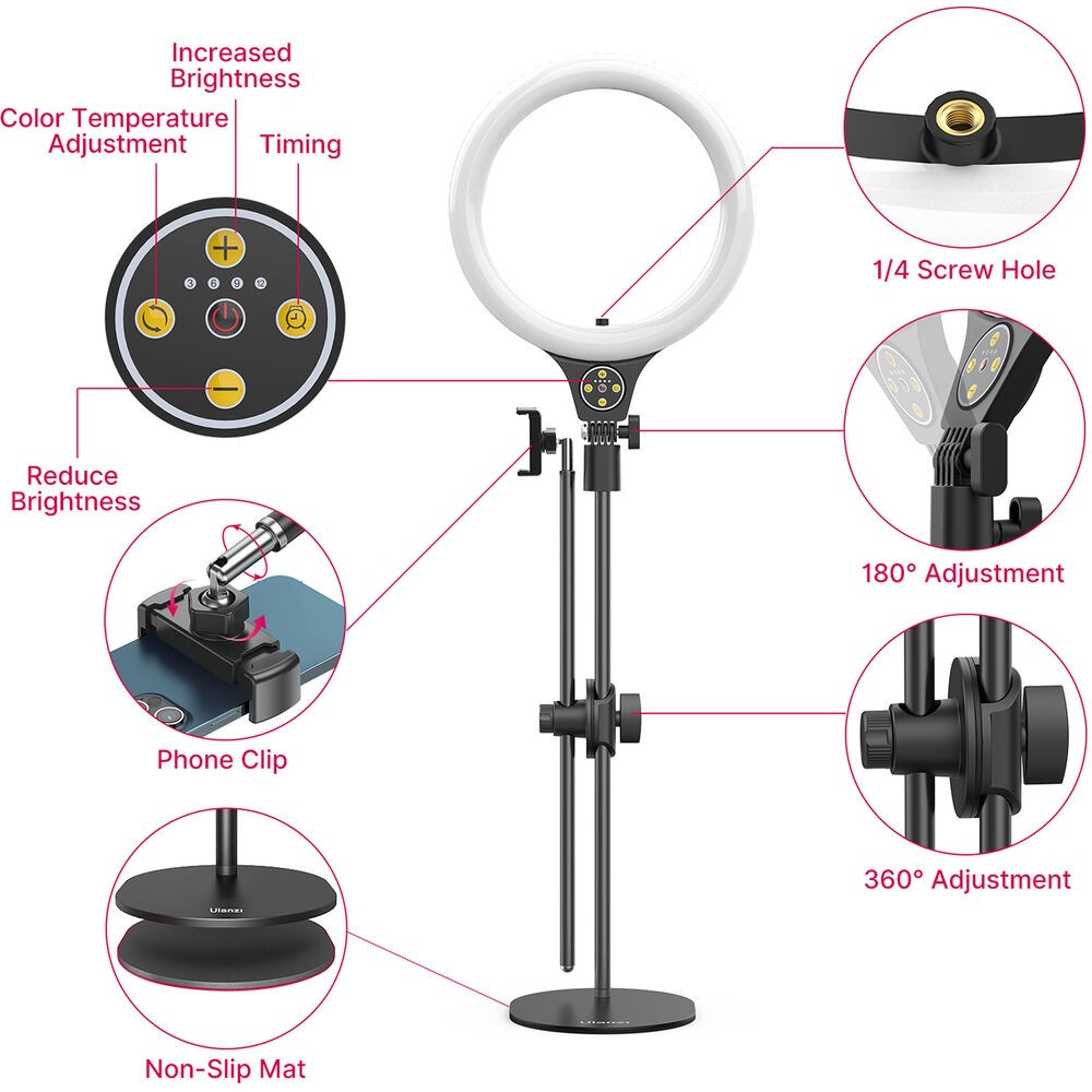 The Ulanzi T1 Desktop Overhead Shooting Bracket Ring Light Set allows creators to illuminate and film subjects from above with precision and flexibility. Its 10-inch LED ring light offers adjustable color temperature from 3500K (warm) to 6500K (daylight) and 11 brightness levels, ensuring optimal lighting for different scenarios. The stand extends up to 32 inches and features two independently adjustable support rods for the light and smartphone, each capable of tilting and rotating 360° for precise positioning.