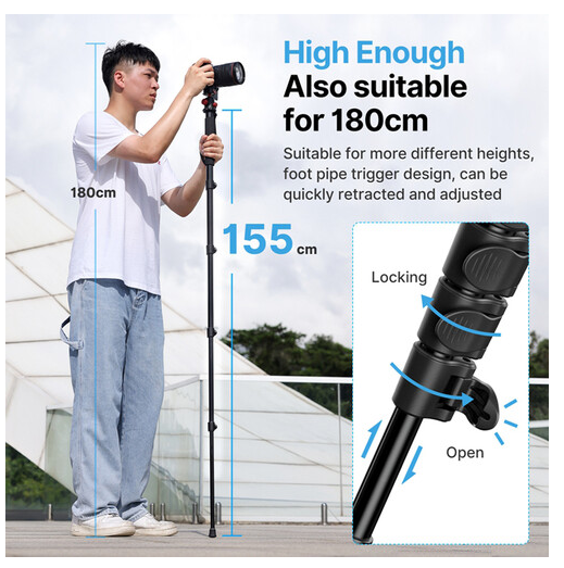 The Ulanzi Aluminum Monopod (61") is an essential tool for photographers and videographers seeking a portable, durable, and flexible support system. Weighing just 13.2 oz, this lightweight monopod supports devices weighing up to 11 lbs, offering a stable platform for cameras, smartphones, and more. With a maximum height of 61", it provides an impressive range for various shooting angles, while its 5-section leg locking system allows easy adjustments and secure positioning. The monopod's aluminum and ABS construction ensures long-lasting durability, and the comfortable foam handgrip with wrist strap ensures added comfort and security while shooting. Additionally, the monopod’s dual 1/4"-20 and 3/8"-16 screw mounts allow compatibility with a wide range of devices, while the 1/4"-20 bottom thread offers further mounting versatility. Whether used as a monopod or a selfie stick, the Ulanzi Aluminum Monopod is ideal for anyone seeking convenience and flexibility in their gear.