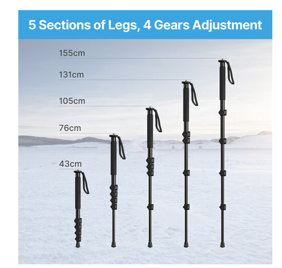The Ulanzi Aluminum Monopod (61") is a lightweight, versatile support for cameras and devices up to 11 lbs. With a maximum height of 61" and a folded length of 17", this monopod features a 5-section leg locking system, dual 1/4"-20 & 3/8"-16 screw mounts, and a comfortable foam handgrip. Perfect for use as both a selfie stick and monopod, it’s designed for stability, portability, and ease of use in various shooting situations.
