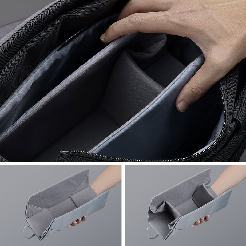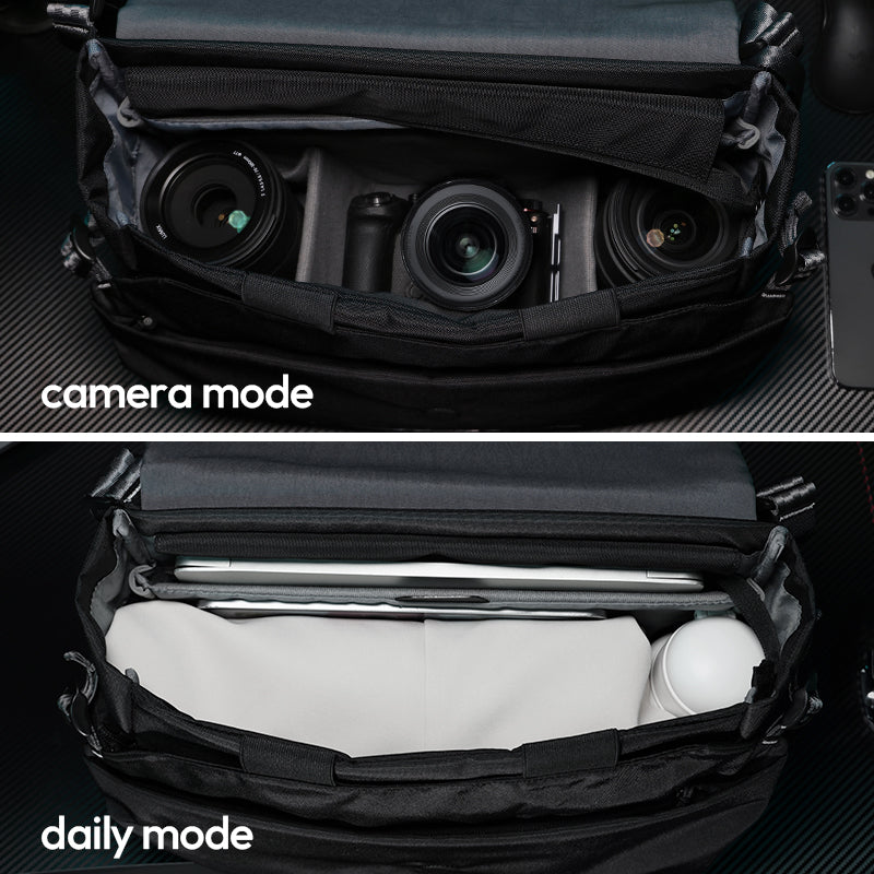 Switch between daily and camera modes with a modular inner divider that folds or detaches as needed.