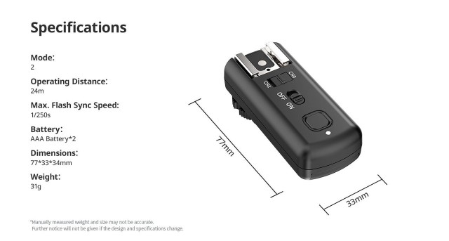 Lightweight and pocket-sized at just 31g, the TT-01 is perfect for on-the-go shooting, whether you’re working in the studio or on location. With a maximum flash sync speed of 1/250s, it delivers dependable performance for portraits, events, and creative lighting setups.