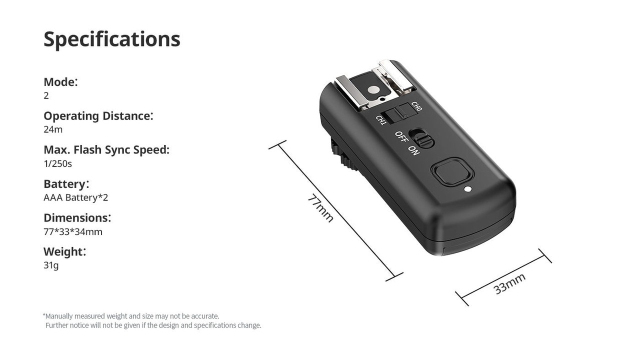 Featuring dual-channel control (CH0 / CH1), the TT-01 enables you to manage multiple flashes on the same channel, making it ideal for multi-light setups. Its single-contact universal hot shoe design ensures wide compatibility across most major camera brands, allowing simultaneous triggering without complicated settings.