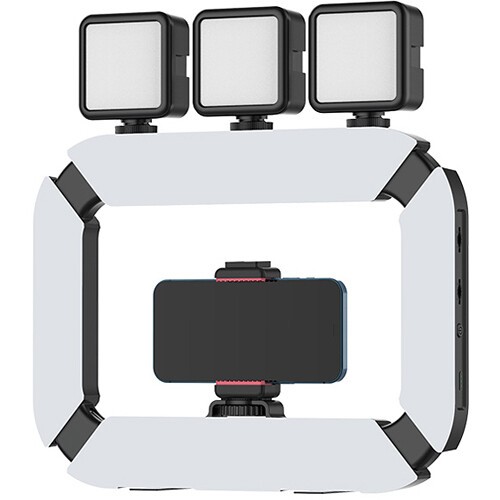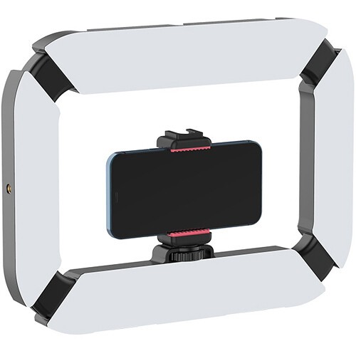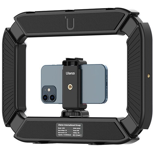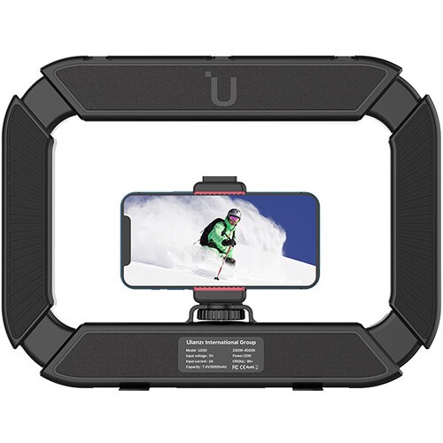 The U200 integrates an 8000mAh lithium-ion battery that powers the light for up to 2.5 hours per charge and is conveniently recharged via USB-C. The rig includes a 1/4"-20 camera/cell phone mount in the center and a bottom 1/4"-20 mount for tripod or support attachment. Three cold shoe mounts allow connection of microphones, handles, or additional lights, expanding your creative setup. Its ergonomic design ensures comfortable handheld use while remaining versatile enough for stationary shooting.