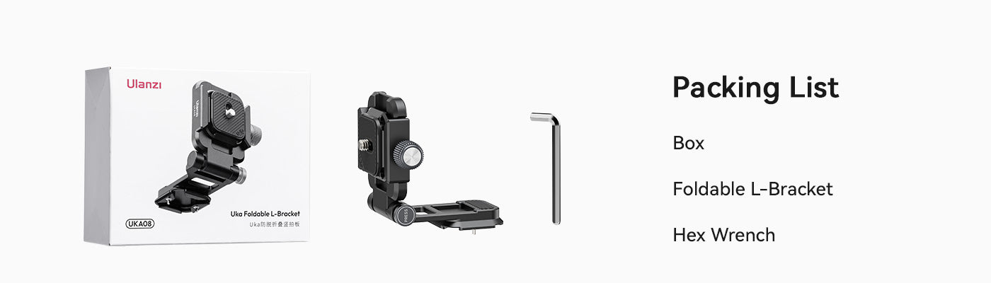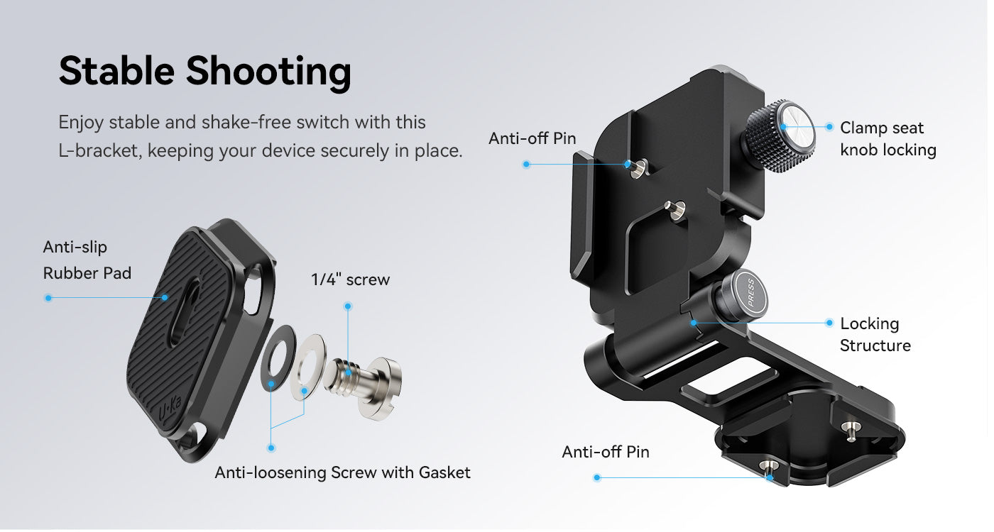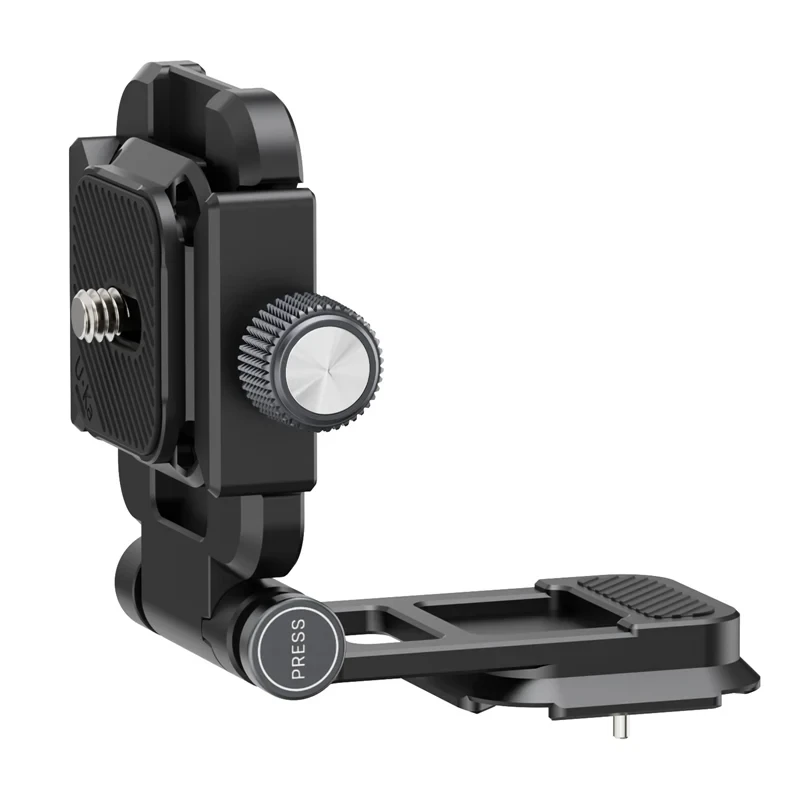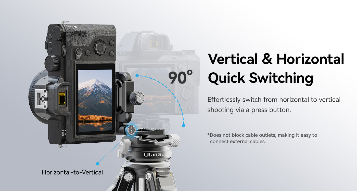 Foldable L-Bracket. Vertical & Horizontal Quick Switching Effortlessly switch from horizontal to vertical shooting via a press button. Compatible with most quick-release plates. Lock and unlock easily with a twist knob.