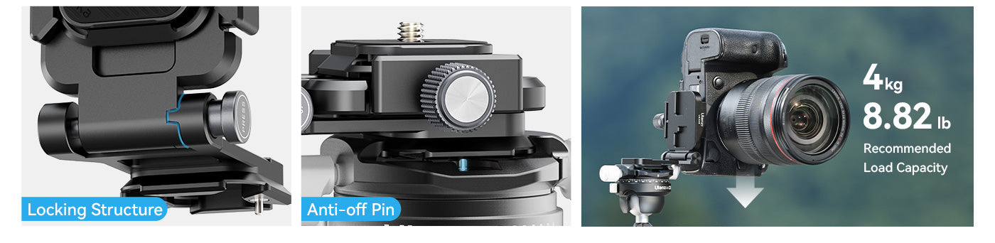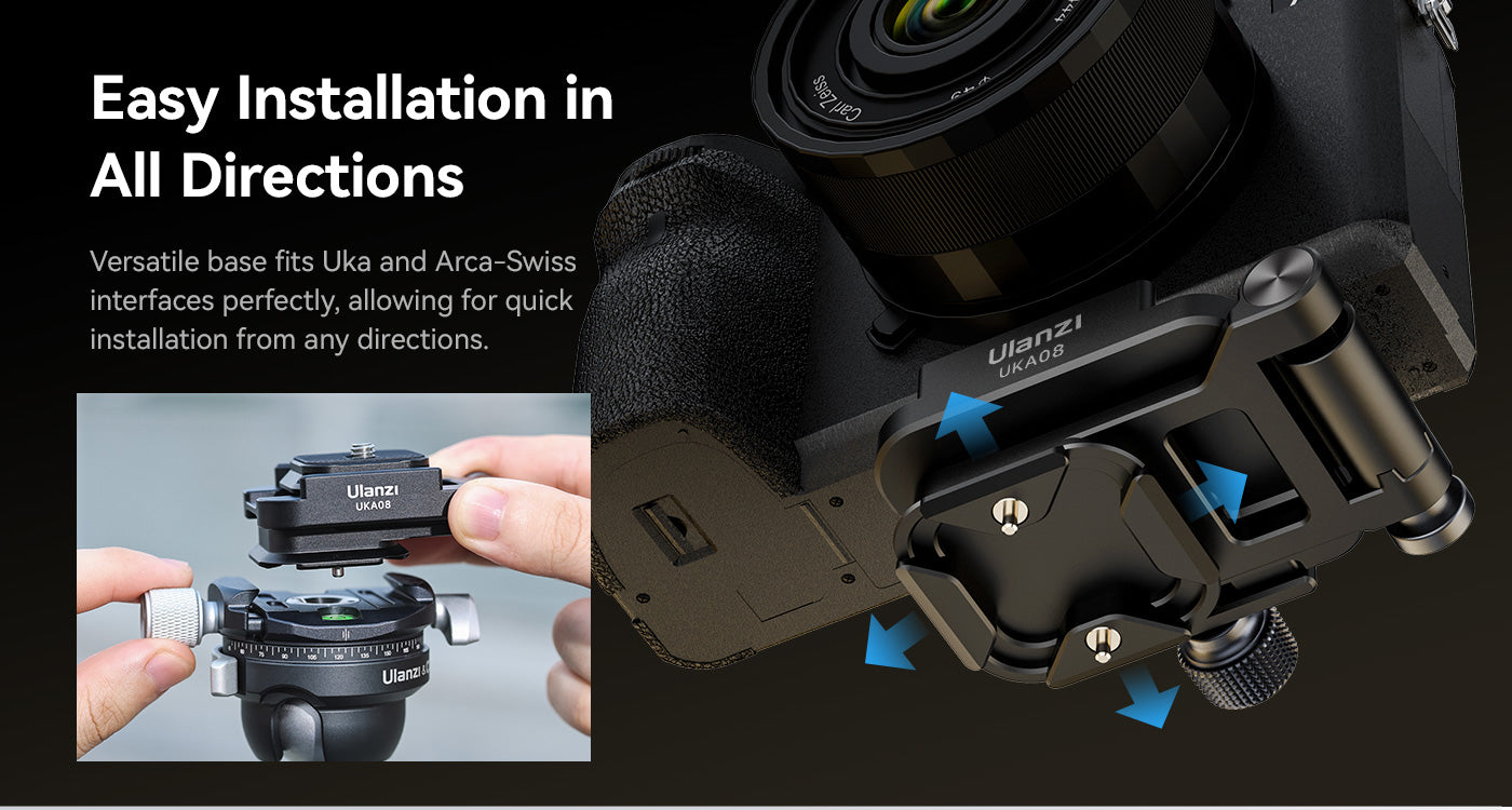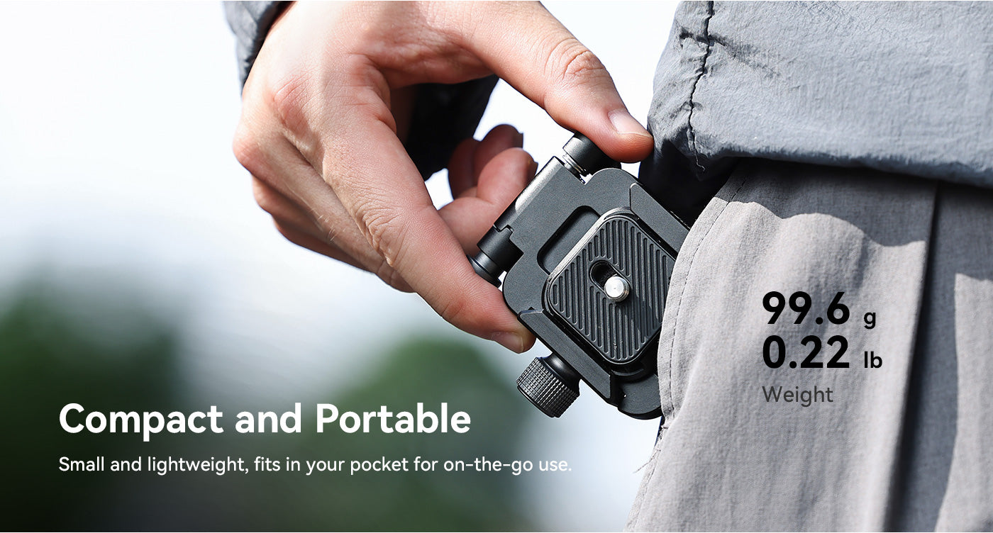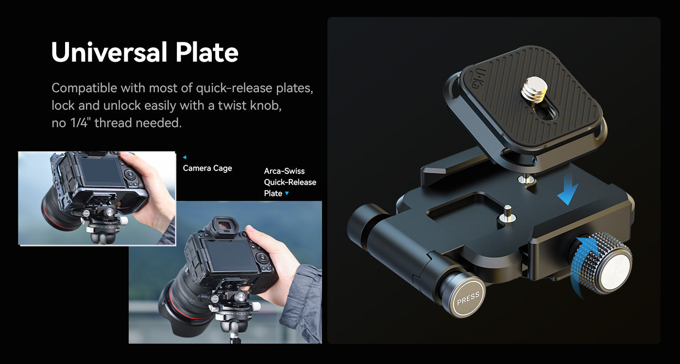 Universal Plate Compatible with most quick-release plates. Lock and unlock easily with a twist knob. No need for 1/4" thread.