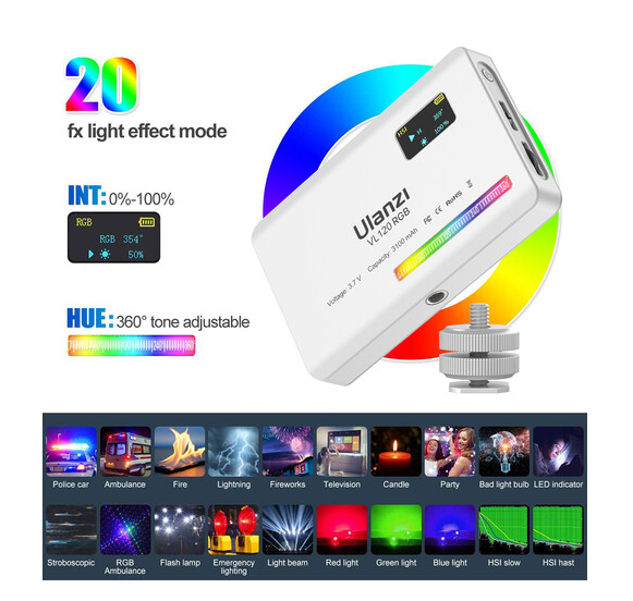 The Ulanzi VL120 RGB LED Video Light (White) is a compact and versatile lighting solution with a variable color temperature range of 2500-9000K, 0-100% dimming, and 20 built-in lighting effects. Powered by a rechargeable 3100mAh battery, it offers a runtime of up to 3 hours and is equipped with an OLED display. Ideal for portable use, it includes a 1/4"-20 thread and a cold shoe adapter for easy mounting.