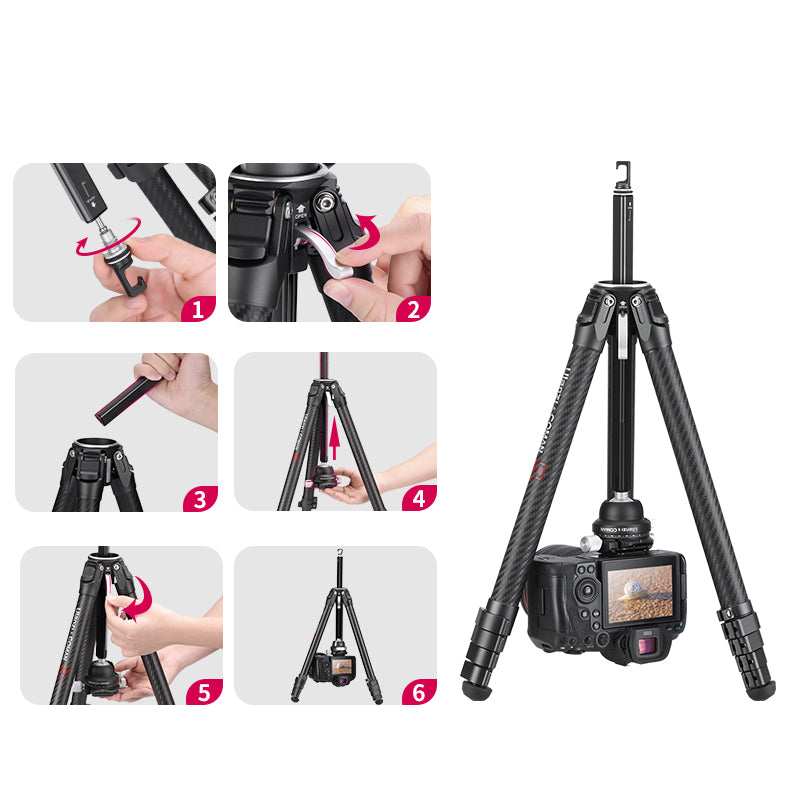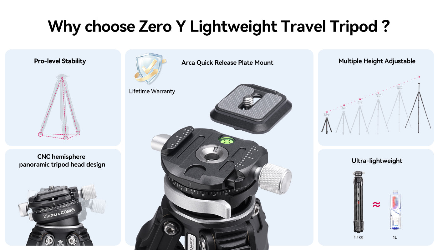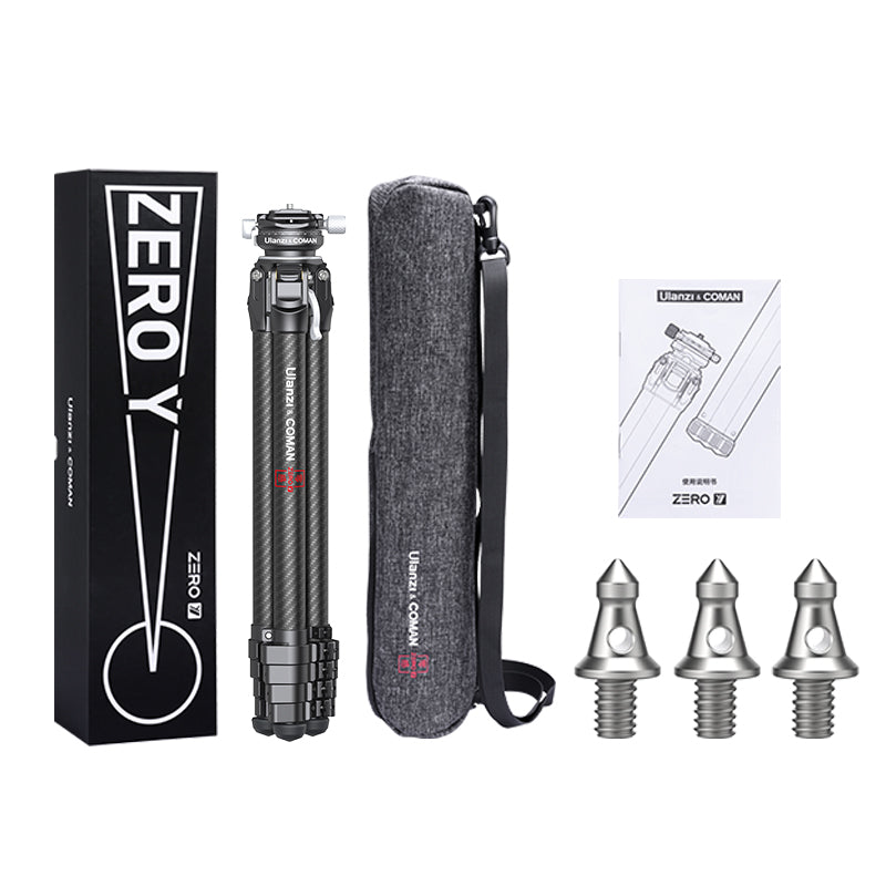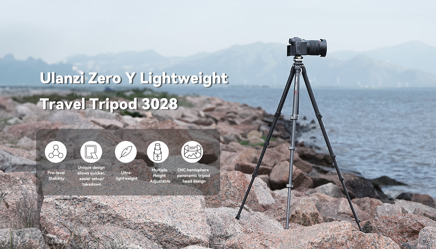 Ulanzi Zero-Y Carbon Fiber Lightweight Travel Tripod 3028. Pro-level Stability. Unique design allows quicker, easier setup/takedown. Ultra lightweight. Multiple Height Adjustable. CNC hemisphere panoramic tripod head design.