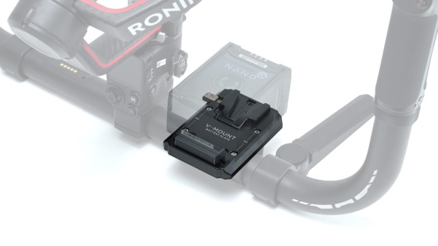 This V-Mount Battery Plate attaches directly to the Basic or Advanced Ring Grip for RS 2 and allows you to power your gimbal with higher capacity V-Mount batteries without external cables.